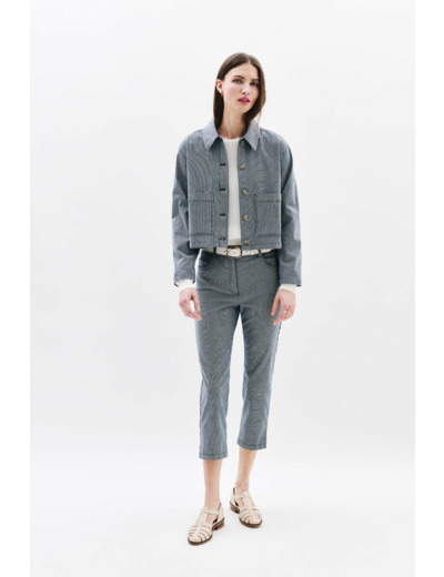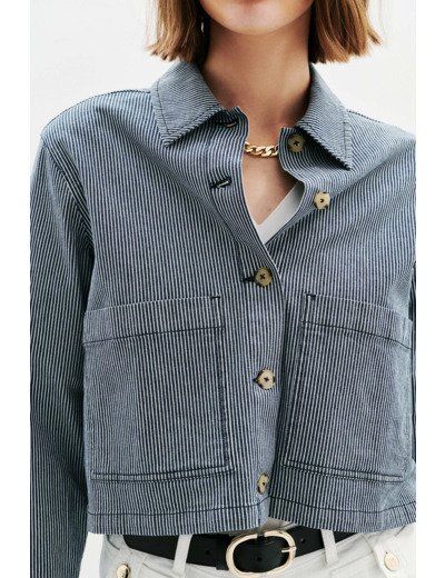 Cette veste est réalisée dans un tissu principal composé à 97 % de coton et 3 % d’élasthanne, garantissant confort et légèreté. Elle présente une fermeture boutonnée, une coupe droite cropped, un col chemise et des manches longues. Sa longueur est de 51 cm pour une taille 38. Pour l’entretien, privilégiez un nettoyage à sec professionnel ou un lavage à 30 °C. Le repassage doit se faire à basse température (maximum 110°) sans vapeur, et le sèche-linge est interdit.