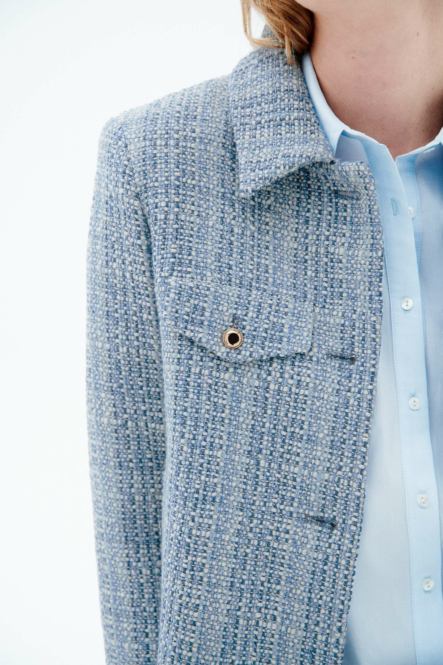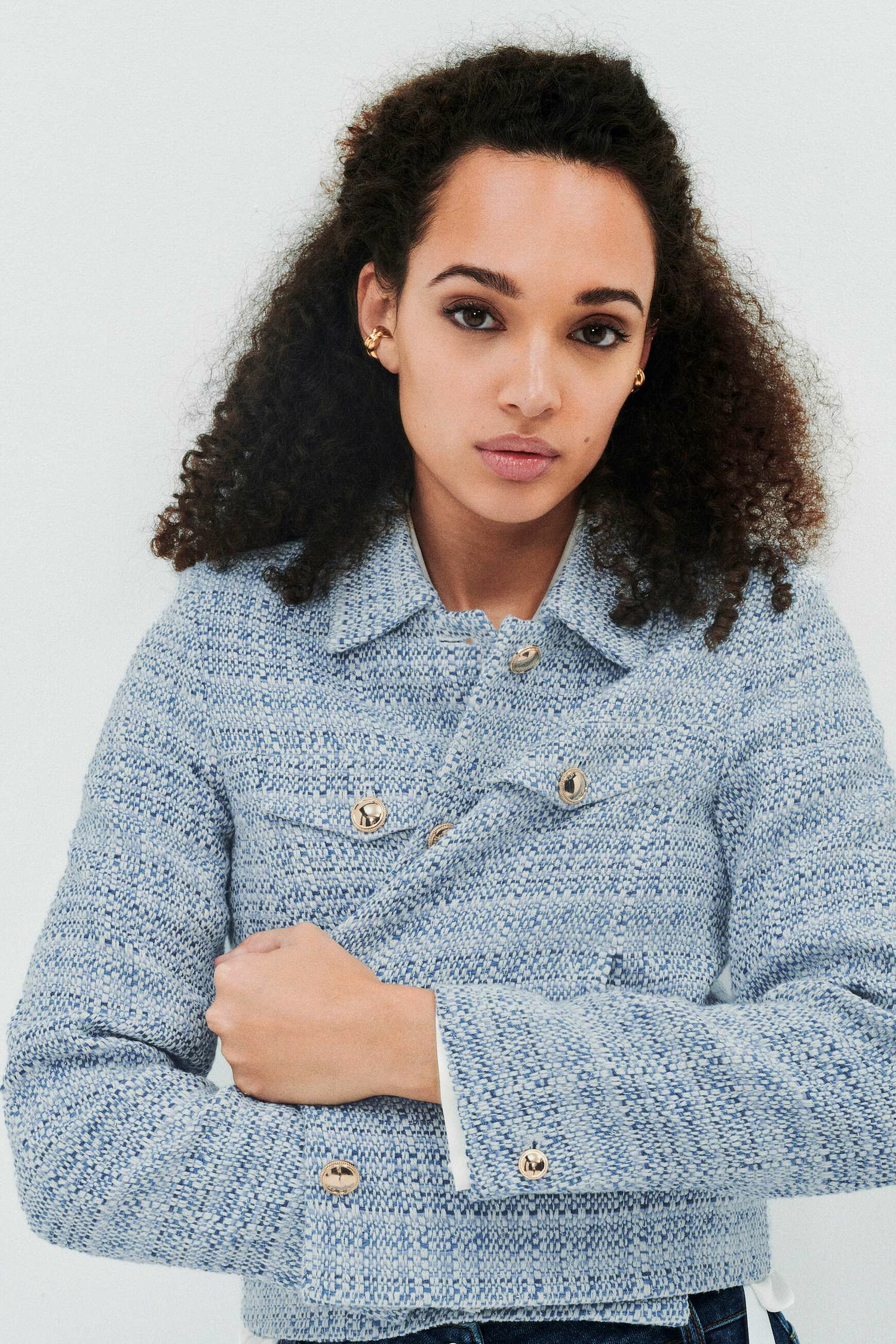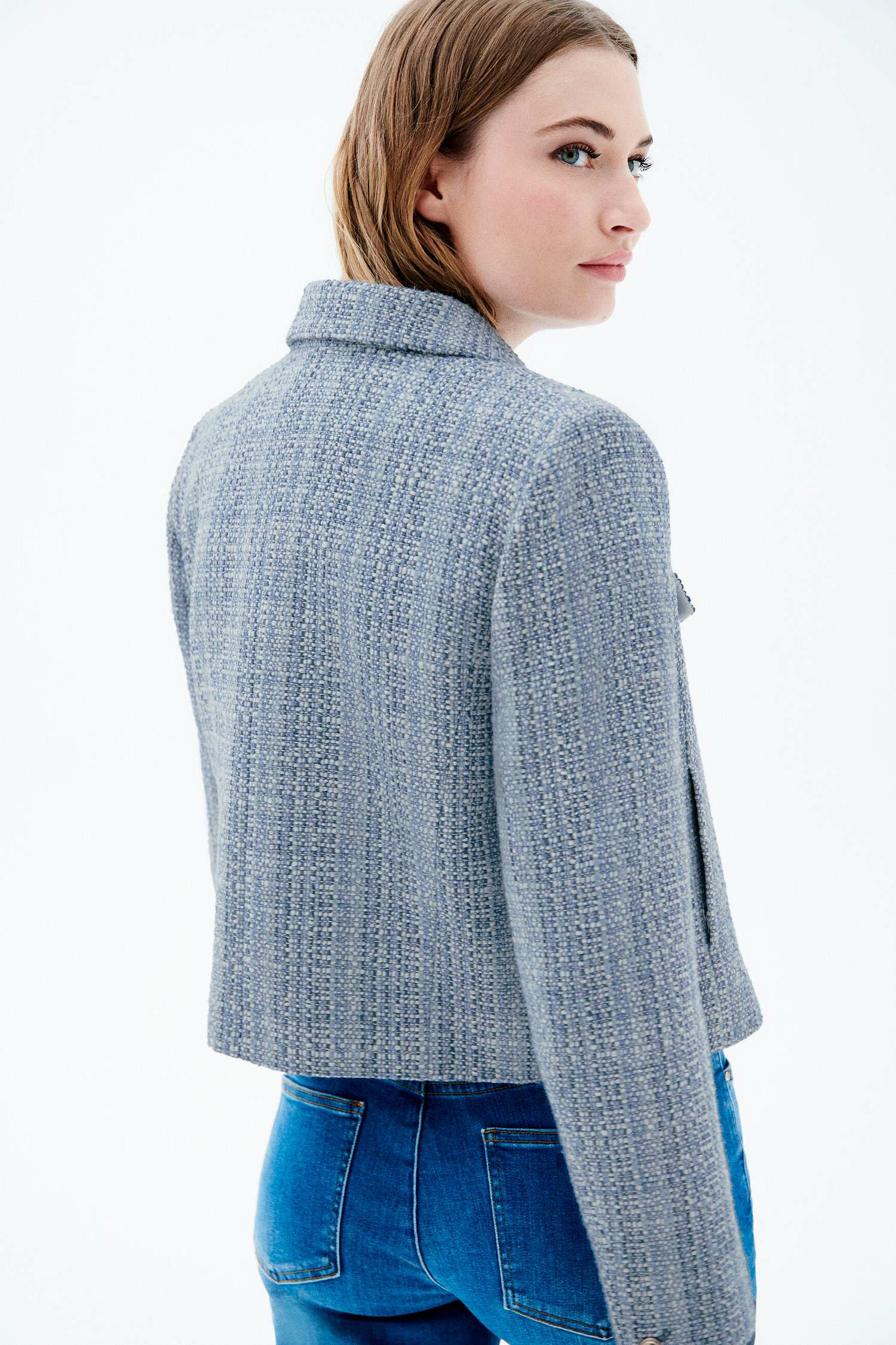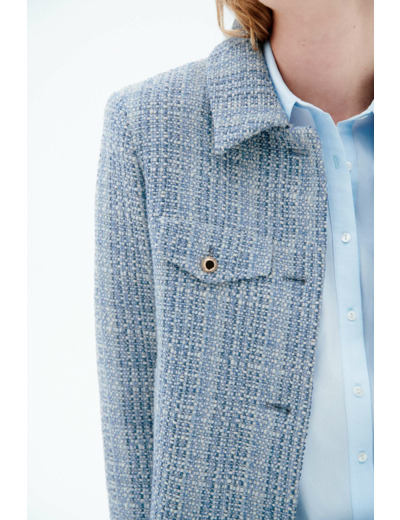 Cette veste courte à la coupe droite se distingue par son col tailleur et ses fausses poches boutonnées à rabat sur la poitrine, qui ajoutent du caractère sans alourdir le style. La fermeture par boutonnière devant et les boutons dorés aux emmanchures soulignent son allure soignée. Polyvalente, elle se porte aussi bien avec un jean droit et un pull léger qu’avec une chemise unie, pour un look formel ou décontracté.