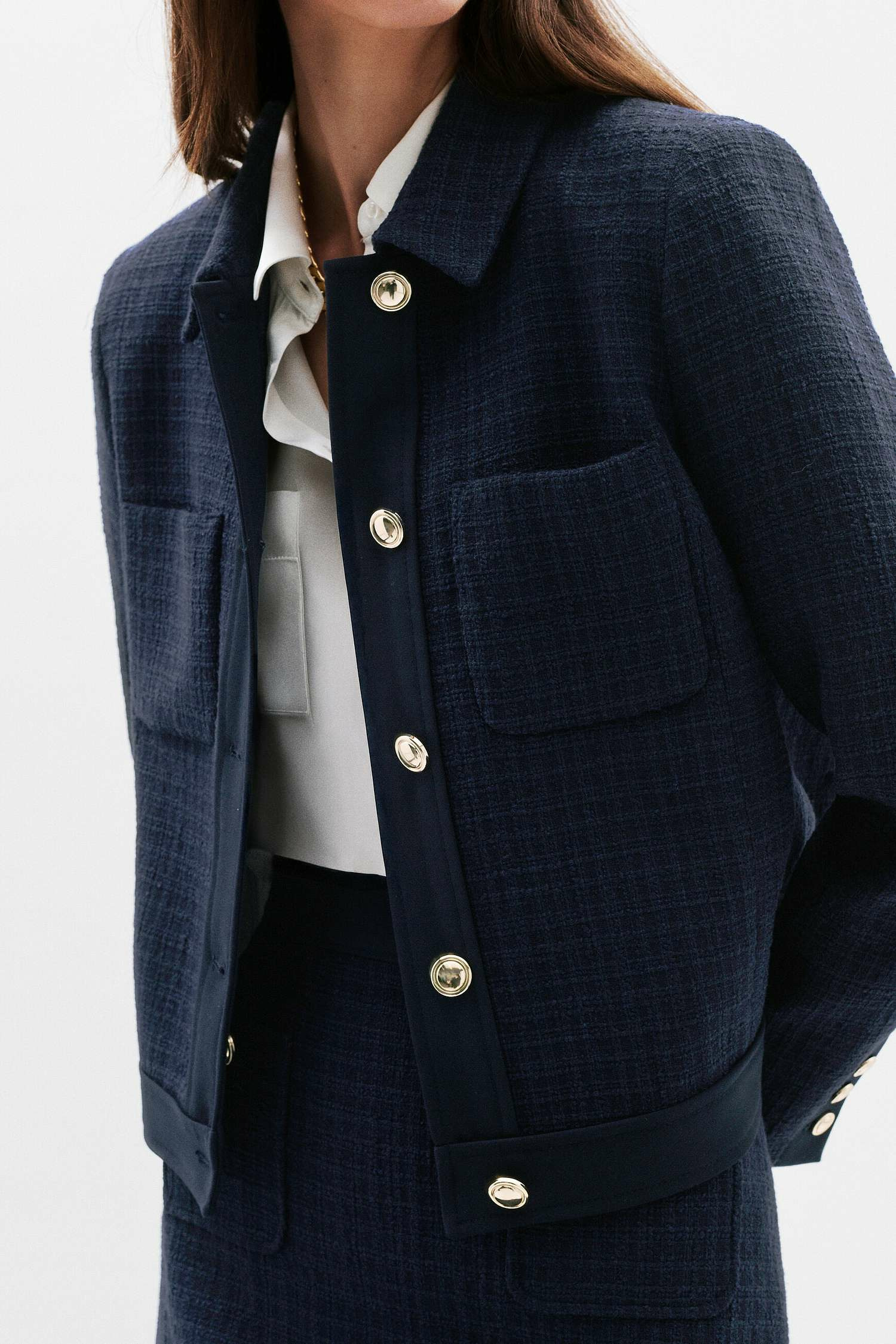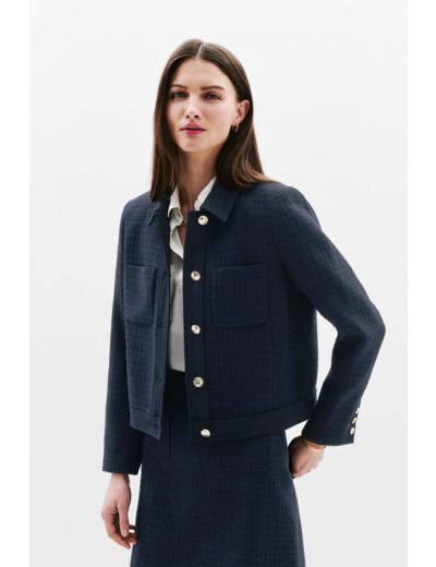 Veste courte à coupe droite, col chemise, manches longues, fermeture boutonnée. Longueur 53 cm en taille 38. Disponible du 34 au 44. Tissu principal en polyester recyclé (42%), coton recyclé (27%), acrylique (11%), viscose (11%) et polyester (6%). Doublure en acétate (53%) et polyester (47%). Doublure manches en acétate 100%. Autres parties en polyester recyclé (74%), viscose (19%) et élasthanne (7%). Entretien uniquement en nettoyage à sec, repassage à basse température (max 110°), sans vapeur ni sèche-linge.