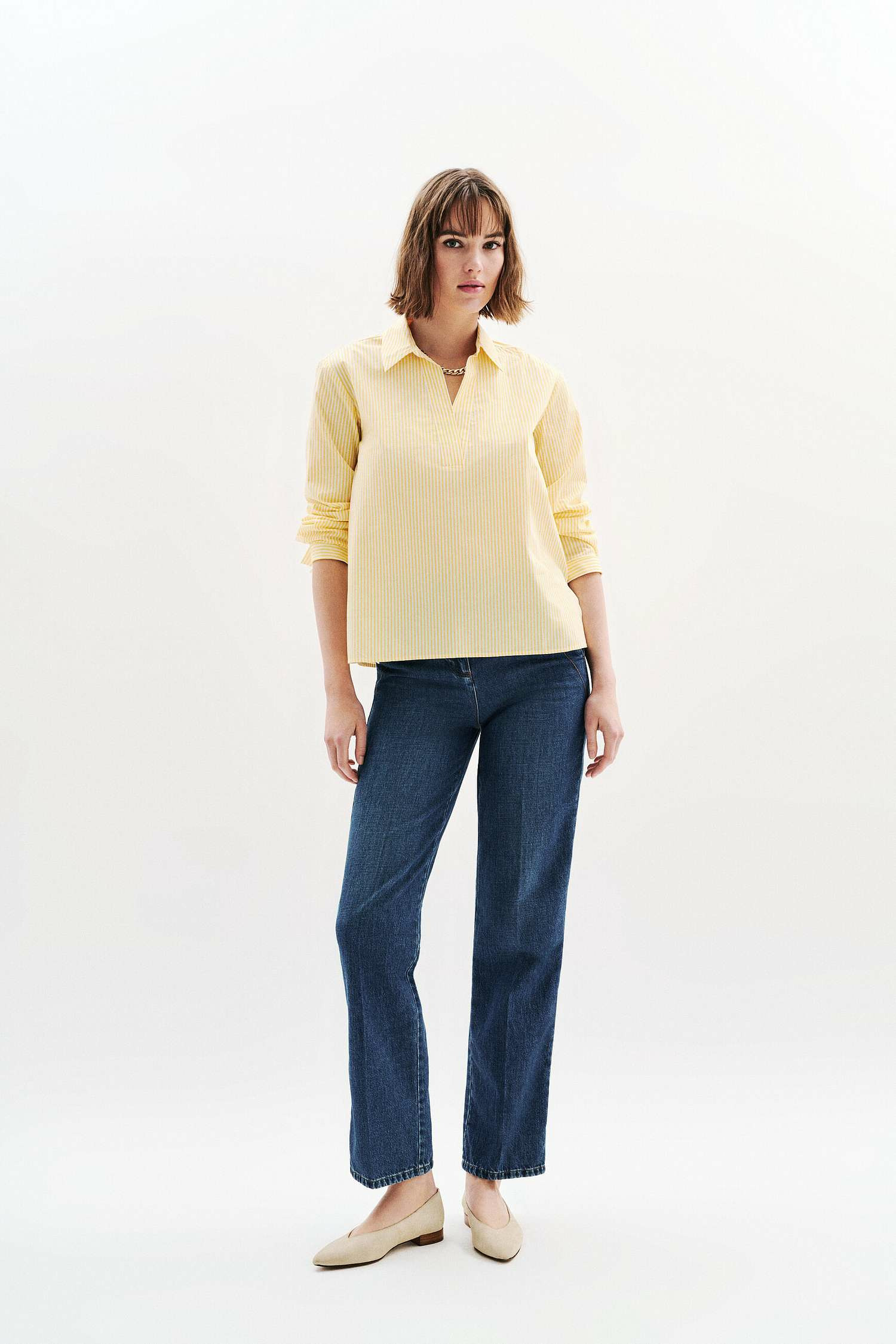 Les détails raffinés, tels que les manches légèrement évasées et le col délicat, apportent une touche de féminité à votre garde-robe. Associez-la à un pantalon tailleur pour un look professionnel chic ou à un jean pour une allure décontractée et tendance.