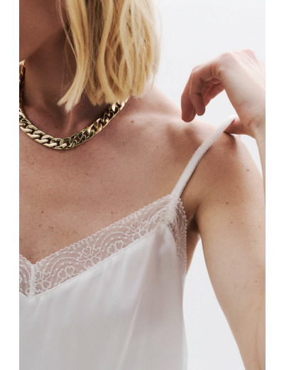 Une pièce chic et glamour à ajouter à votre dressing féminin. Le caraco Clea se dévoile dans un coloris blanc immaculé, surmonté de dentelle délicate signant un top raffiné. Sous un blazer pour un look tailleur ultra féminin, il se porte au quotidien avec votre jean préféré faisant rimer décontraction et féminité. - Caraco col v - Empiècement dentelle - Fines bretelles ajustables - Longueur, 58 cm pour une taille S
