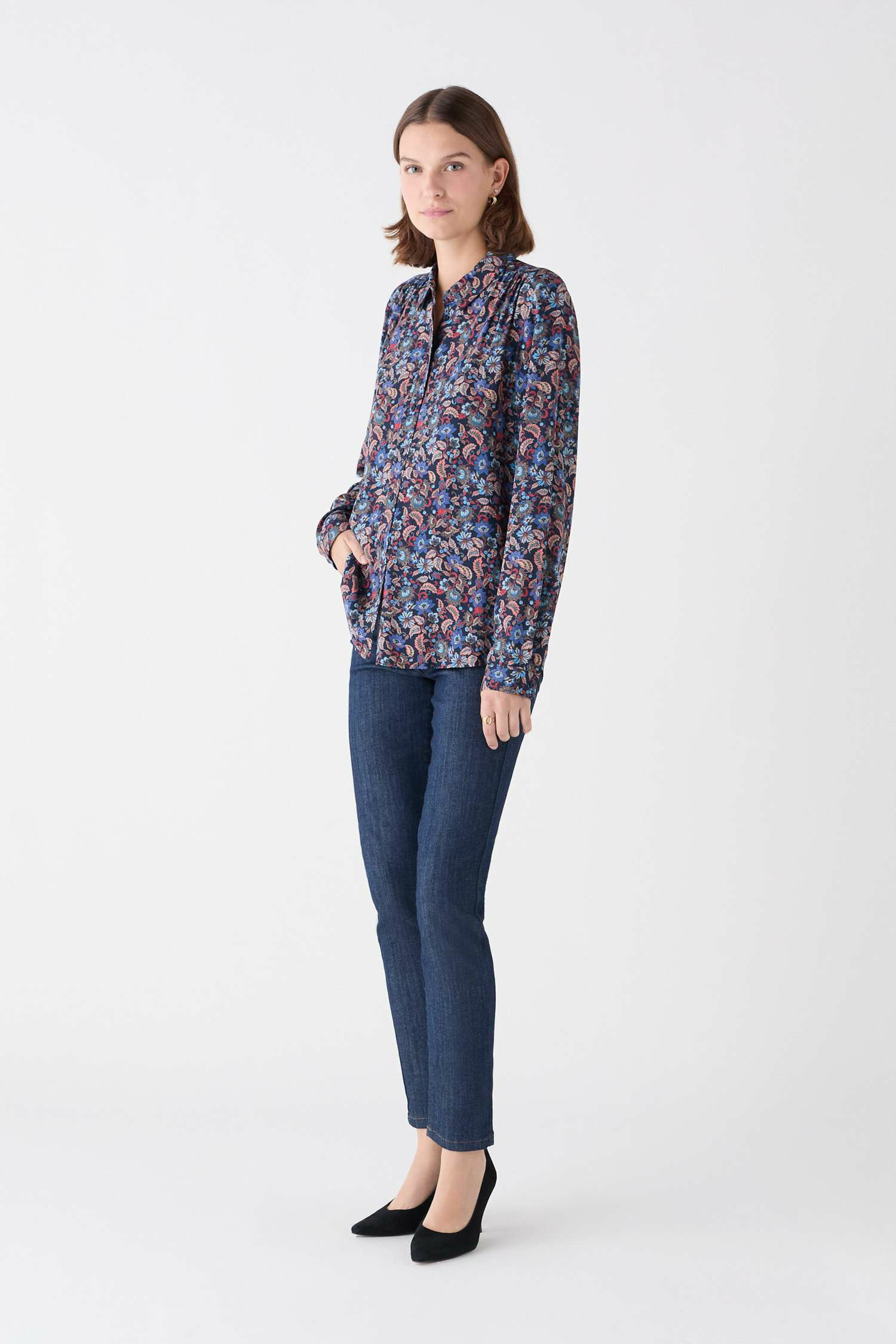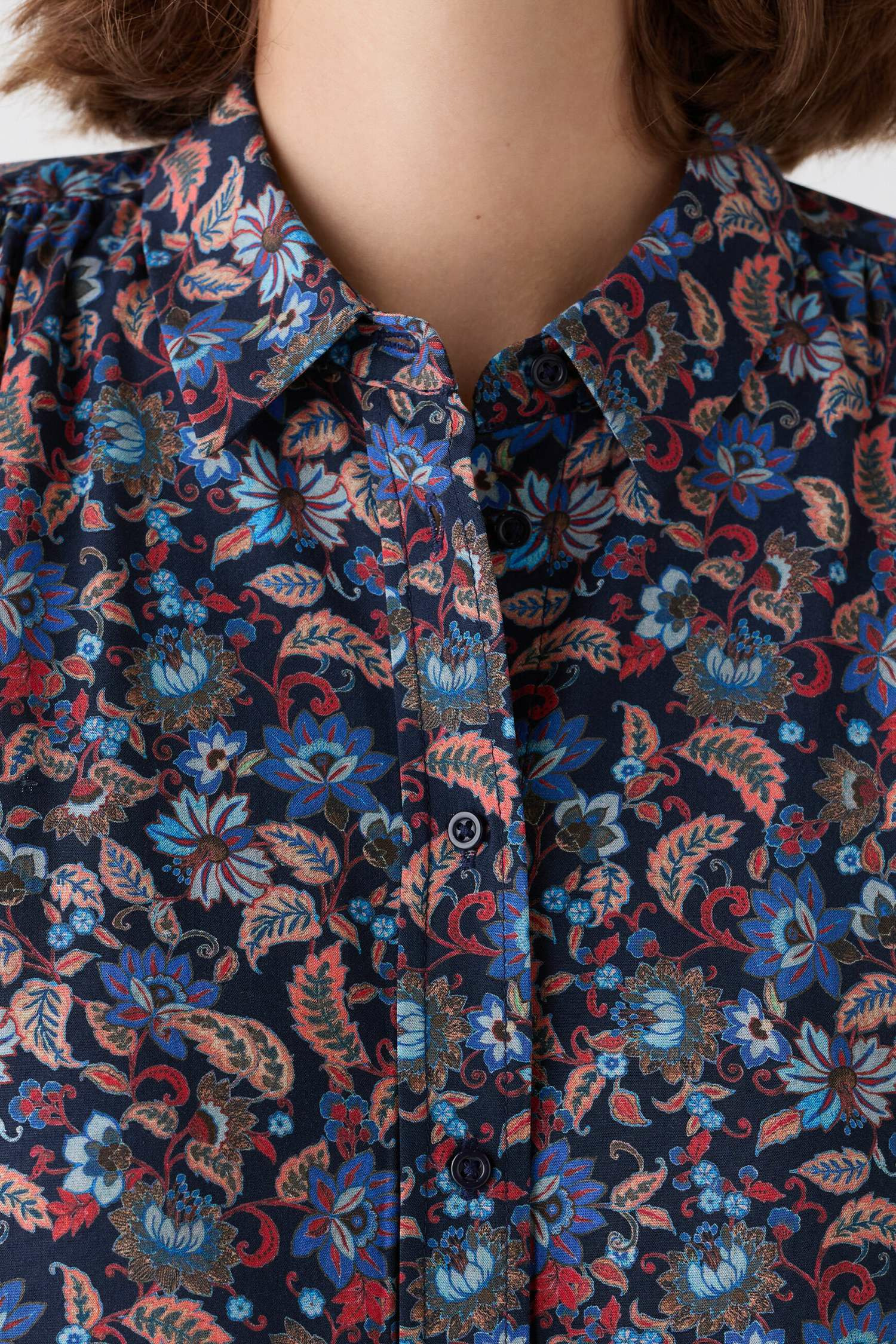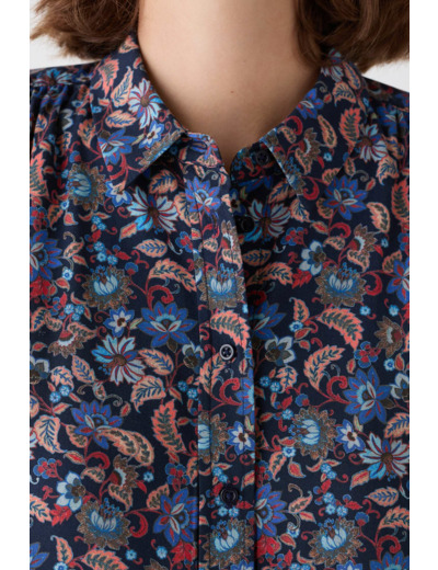 Tissu principal : 100 % viscose. Col chemise. Manches longues. Longueur 67 cm pour une taille 38. Fermeture par boutonnière. Lavage conseillé à 30°C avec action réduite pour préserver la qualité du tissu.