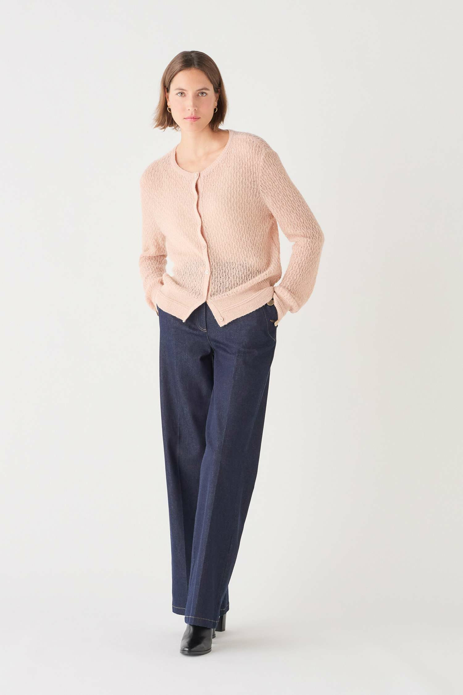 Le gilet Mjade, nouveauté de la saison, se distingue par son design droit qui allonge la silhouette et qui convient à toutes les morphologies. Tricoté en mélange d'alpaga et de laine, il vous offre une chaleur douce et enveloppante. Parfait pour diverses occasions, il ajoute une touche chic à votre quotidien. - Gilet droit - Col rond - Longueur 55 cm pour une taille S - Manches longues Idées look - Le gilet Mjade se marie bien avec un pantalon large en denim et des bottines à talons pour une tenue chic décontractée. - Ce gilet droit peut être combiné avec une robe fluide mi-longue et des escarpins pour un look élégant. Conseil entretien Lavez votre gilet à la main à l'eau froide pour préserver la qualité des fibres d'alpaga et de laine. Le repassage est fortement recommandé : effectuez-le à basse température (maximum 110°) et sans vapeur. Il est interdit d'utiliser le sèche-linge ou de faire nettoyer ce gilet en pressing.