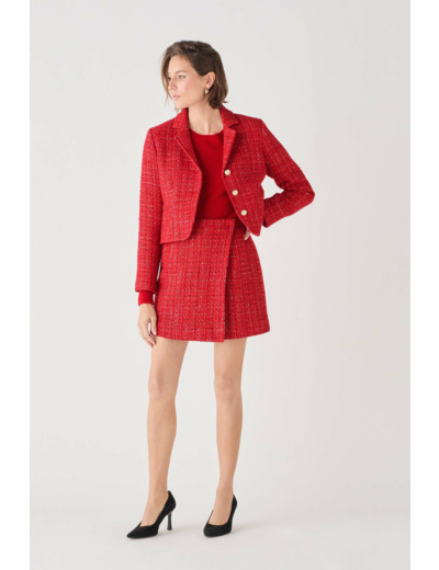 Cet hiver Caroll réinvente l'intemporel tweed. Chic et élégant, le tweed s'associe au rouge passion. Réhaussée par des touches brillantes d'argent et de doré, cette capsule se porte en total look ou mixée avec son dressing. Elegante et chaleureuse, la collection parfaite pour les fêtes de fin d'année ! La jupe Jchristmas se distingue par son effet tweed, parfait pour les cérémonies et grandes occasions. Sa coupe courte vous assure un confort élégant et une grande liberté de mouvement lors d'événements importants. - Jupe courte - Longueur 44,5 cm pour une taille 38 - Avec doublure Idées look - La jupe Jchristmas s'accorde avec le blazer en tweed assorti Vchristmas et des escarpins noirs pour une tenue élégante. - Cette jupe fluide se marie bien avec un pull ajusté à col roulé et des bottines pour un look chic au quotidien. Conseil entretien Pour maintenir la qualité de votre jupe Caroll, il est très fortement recommandé de procéder à un nettoyage à sec par un professionnel en pressing. Le lavage, que ce soit en machine ou à la main, est interdit. Concernant le repassage : il est possible mais doit se faire à basse température (maximum 110°) et l'utilisation de vapeur est interdite pour éviter des dommages irréversibles. Enfin, l'usage du sèche-linge est également interdit.