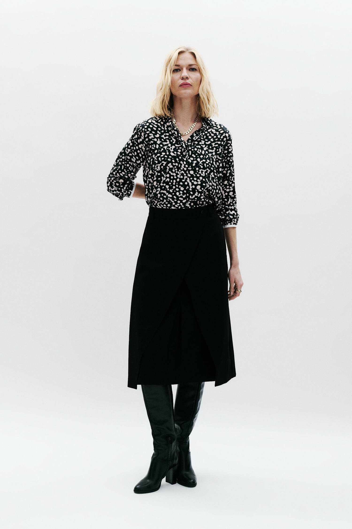 Réponse : Elle se porte élégamment avec un chemisier fluide et des escarpins ou de manière plus décontractée avec un pull ajusté et des bottines.