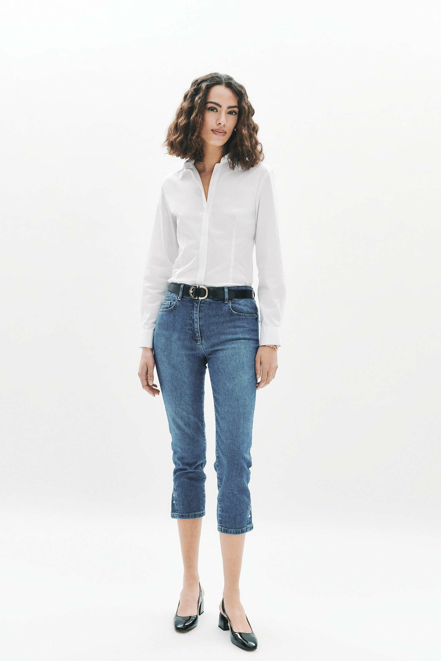 Pantacourt slim en coton et chanvre, une matière réputée pour ses nombreux bénéfices : écologique, non-irritante, antibactérienne etc. Ce modèle à la longueur 7/8ème dévoile de façon élégante vos chevilles. - Ceinture à même avec passants - Modèle 5 poches - Boutons décoratifs à la cheville - Coutures apparentes décoratives - Longueur totale,85 cm pour une taille 38