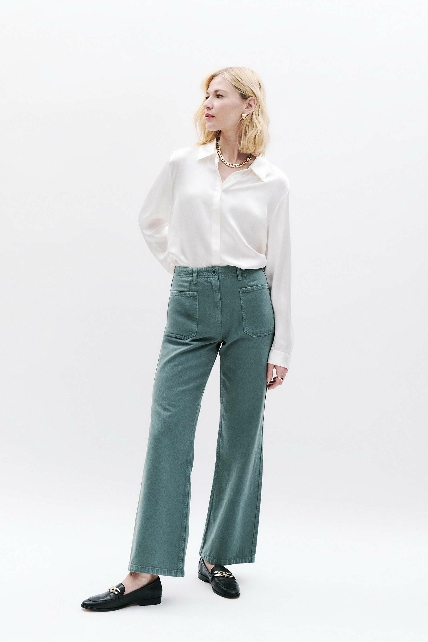 Le pantalon Passenger, un essentiel pour une allure chic décontractée. Sa coupe flatteuse s'adapte à toutes les morphologies et allonge la silhouette. Idéal pour diverses occasions. - Pantalon - Longueur totale 106 cm pour une taille 38 - Coupe légèrement évasée - Taille haute - Ceinture à même avec passants Idées look - Le pantalon Passenger peut s'associer avec un pull en cachemire et des mocassins pour une tenue chic au quotidien. - Ce pantalon se marie parfaitement avec une blouse fluide et des sandales à talons pour un look élégant. Conseil entretien Le nettoyage à sec par un professionnel en pressing est très fortement recommandé pour prolonger la durée de vie de votre pantalon. Toutefois, vous pouvez également le laver à 30°C en cycle délicat et sur l'envers pour préserver sa couleur. Pour le repassage : il est recommandé - effectuez-le à basse température (maximum 110°) et n'utilisez pas de vapeur, car cela pourrait causer des dommages irréversibles. Il est interdit d'utiliser le sèche-linge.