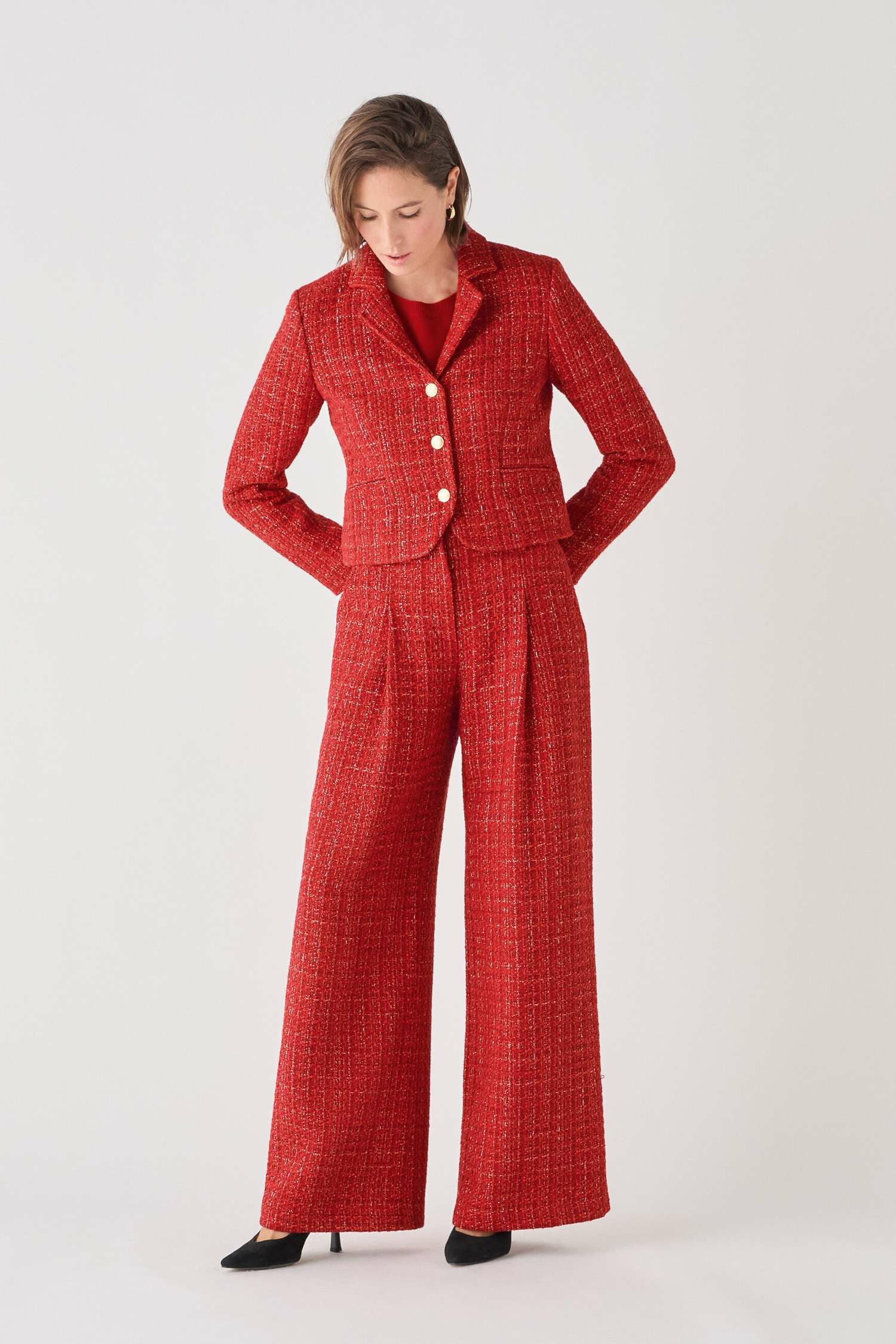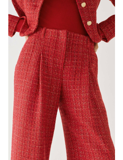 Cet hiver Caroll réinvente l'intemporel tweed. Chic et élégant, le tweed s'associe au rouge passion. Réhaussée par des touches brillantes d'argent et de doré, cette capsule se porte en total look ou mixée avec son dressing. Elegante et chaleureuse, la collection parfaite pour les fêtes de fin d'année ! Le pantalon Pchristmas, avec sa coupe large et taille haute, sublime la silhouette. Adoptez son style élégant pour diverses occasions. - Coupe large - Taille haute - Modèle avec poches - Longueur totale 108 cm pour une taille 38 - À associer aux vestes Vchristmas Idées look - Le pantalon Pchristmas peut être porté avec un pull ajusté et des bottines pour une tenue élégante. - Ce pantalon large se combine parfaitement avec une veste structurée à boutons dorés, créant ainsi un ensemble harmonieux. Conseil entretien Pour préserver la qualité de votre pantalon Caroll, il est très fortement recommandé de privilégier un nettoyage à sec par un professionnel en pressing. Toutefois, vous pouvez également opter pour un lavage à 30°C en cycle délicat. Concernant le repassage : il est possible mais doit se faire à basse température (maximum 110°), et l'utilisation de vapeur est interdite car elle peut causer des dommages irréversibles. Le sèche-linge est interdit pour ce pantalon.