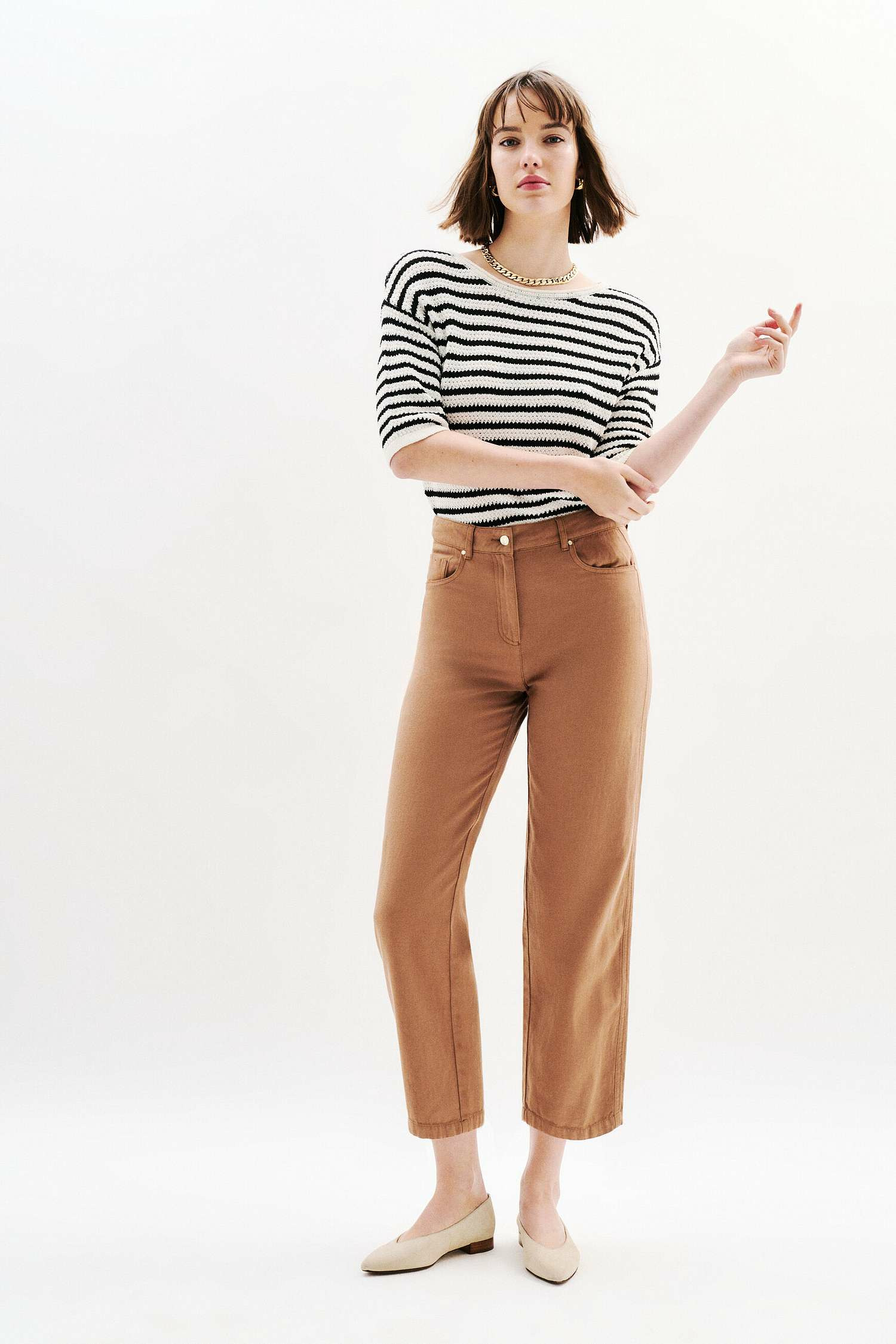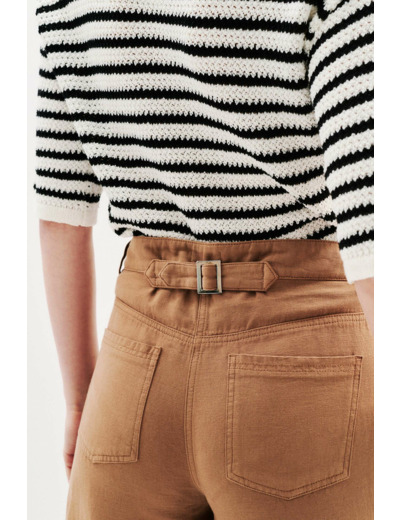 Le pantalon Perrin se distingue par sa taille haute, qui souligne élégamment la silhouette. Contenant du lin, il vous offre une légèreté adaptée à toutes les températures. Ceinturé pour un ajustement parfait, il incarne le style casual chic. Pièce coup de cœur idéale pour diverses occasions. - Pantalon - Taille haute - Modèle 7/8e - Longueur 95,5 cm pour une taille 38 Idées look - Le pantalon Perrin peut être assorti à un pull rayé et des ballerines pour une tenue casual chic. - Ce pantalon ceinturé se combine parfaitement avec un chemisier fluide et des escarpins pour une allure élégante au quotidien. Conseil entretien Pour préserver la qualité de votre pantalon, il est très fortement recommandé de le confier à un professionnel pour un nettoyage à sec en pressing. Toutefois, vous pouvez également opter pour un lavage délicat à 30°C sur l'envers afin de conserver sa couleur d'origine. Le repassage est possible : il doit s'effectuer à basse température (maximum 110°) et sans vapeur. Il est interdit d'utiliser le sèche-linge privilégiez plutôt un séchage à l'air libre.