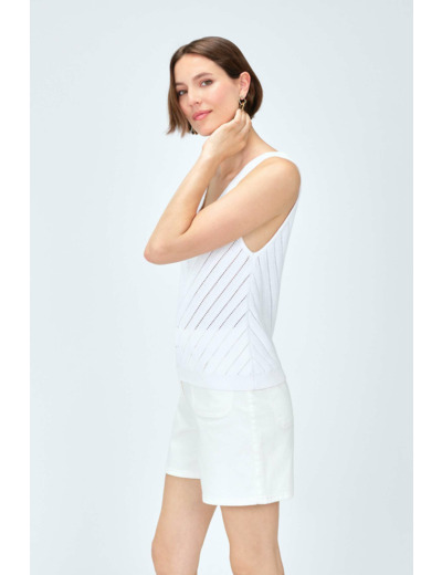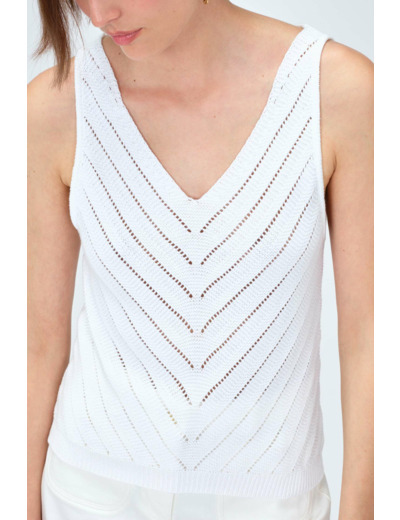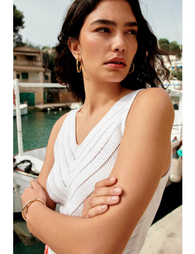 Léger et confortable grâce à sa confection en 100% coton, le pull manel présente une coupe droite. Il est orné de délicats détails ajourés façon chevrons pour un résultat très élégant. - Col V - Modèle sans manches - Fine jauge - Finition bord-côte - Longueur, 55 cm pour une taille S