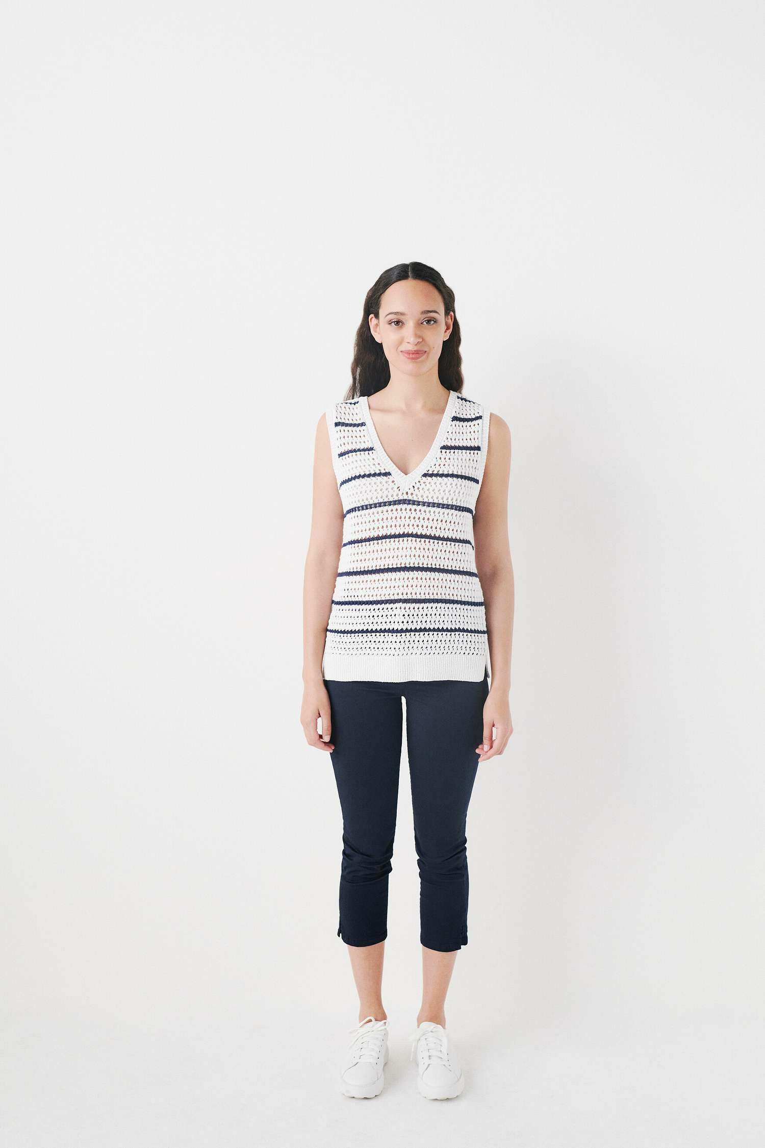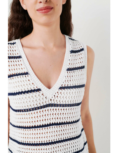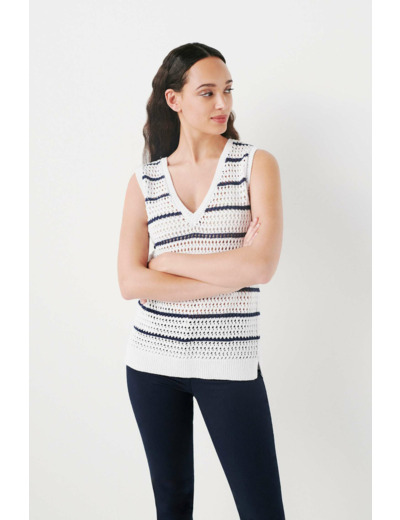 Le pull mkaren vous enveloppe dans un tissu 100% coton décoré de jolies rayures. Un modèle en maille très confortable et élégant. - Col V - Sans manches - Maille ajourée - Finitions bords-côtes - Longueur, 55 cm pour une taille S