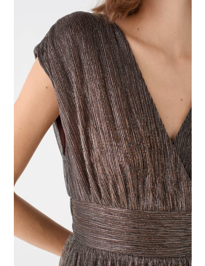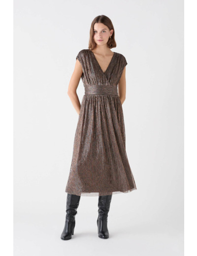 La robe rguesta est une pièce très féminine, grâce à sa jolie coupe patineuse évasée sous la taille et sa teinte unie festive. Réalisée en polyester mélangé, ce modèle d'exception vous habille d'une étoffe légère et agréable à porter. - Col V - Manches courtes - Taille ajustée - Jupe fluide - Longueur 119 cm pour une taille 38 - Finitions métallisées - Modèle doublé