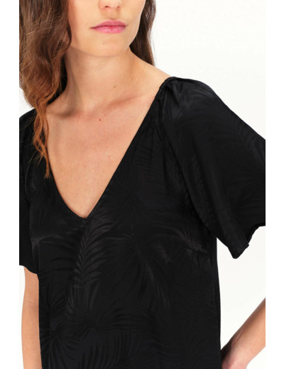 Découvrez l'élégance de la robe riman, composée à 100 % de viscose, une matière douce lui apportant un aspect soyeux. Ce modèle court à la coupe droite est orné de discrets motifs aux allures végétales ton sur ton. - Col en V - Manches courtes évasées - Lacets à nouer dans le haut du dos - Longueur 95 cm pour une taille 38