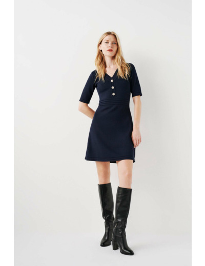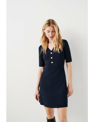 La robe rudie emprunte son style ultra féminin aux iconiques modèles des années 60 : une pièce à la coupe trapèze élégante, confectionnée en viscose mélangée, vous assurant un porter agréable. Modèle court de couleur unie. - Col V - Manches courtes - Taille marquée - 3 boutons métalliques sur la poitrine - Empiècements texturés - Longueur 90 cm pour une taille 38