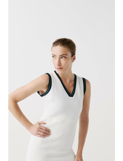 Sport et mode unissent leurs forces ! Cette année, l'été est placé sous le signe du sport. L'occasion pour Caroll de proposer une collection capsule aux allures sportives ! Un vestiaire chic et mode qui vient emprunter ses codes au sportwear. À porter sur le terrain ou au quotidien ! La robe rvic est confectionnée en 100 % polyester. Sa coupe est courte et ajustée. Ce modèle est léger, adapté pour un style sportswear chic. - Col V - Sans manches - Longueur totale 92 cm pour une taille 38 - Finitions bords-côtes - Doublure 100 % viscose