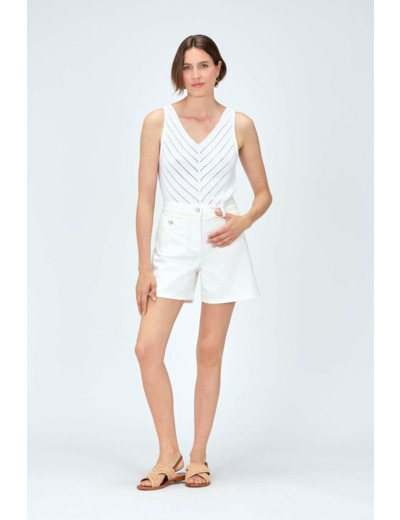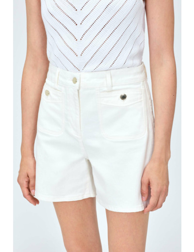 Short confectionné en mélange de coton, confortable à porter, le modèle saphir est uni et court. - Ceinture à même avec passants - Poches à rabat avec boutons devant - Finitions en métal doré - Longueur entrejambe 13cm - Fermeture par un bouton et un zip sous patte