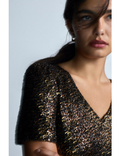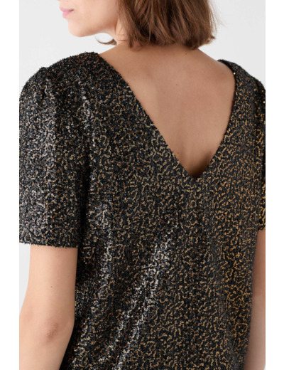 Parez-vous de lumière grâce au t-shirt talex : ce modèle très féminin, réalisé en 100% polyester pour vous assurer une belle légèreté, tout en vous couvrant d'une teinte scintillante. Coupe droite. - Col V - Manches courtes - Dos échancré - Longueur 58 cm pour une taille S - Modèle avec sequins métallisés - T-shirt doublé