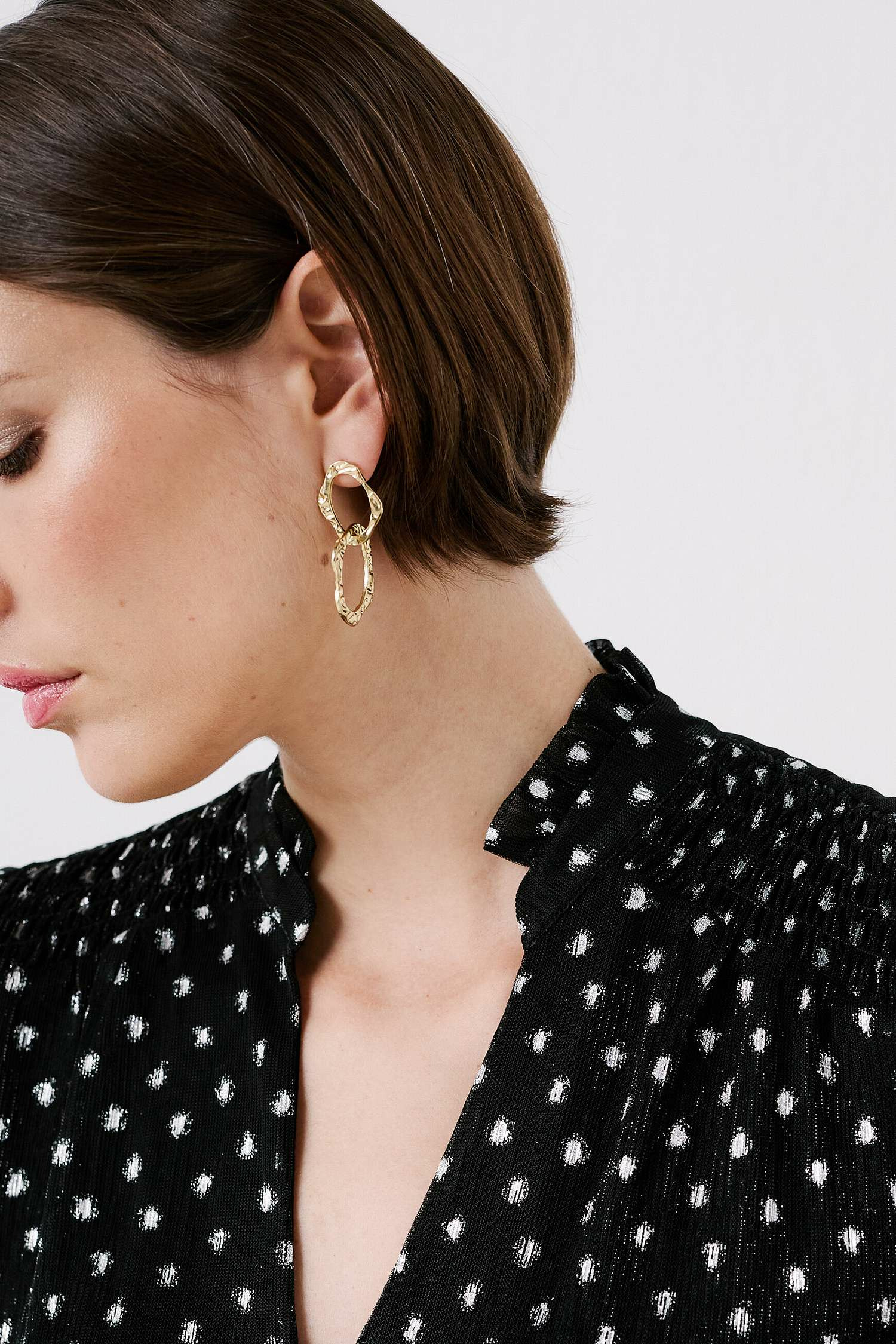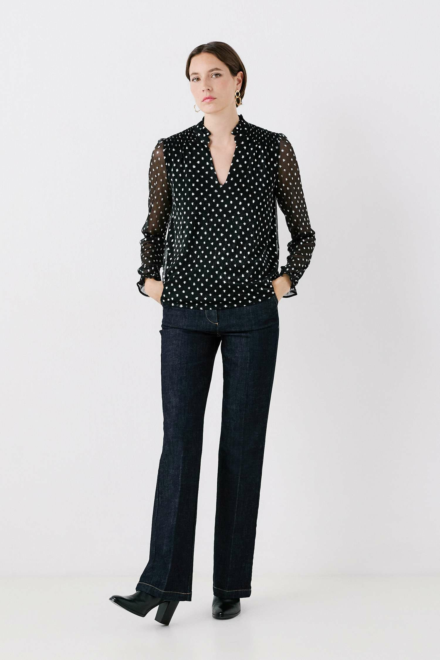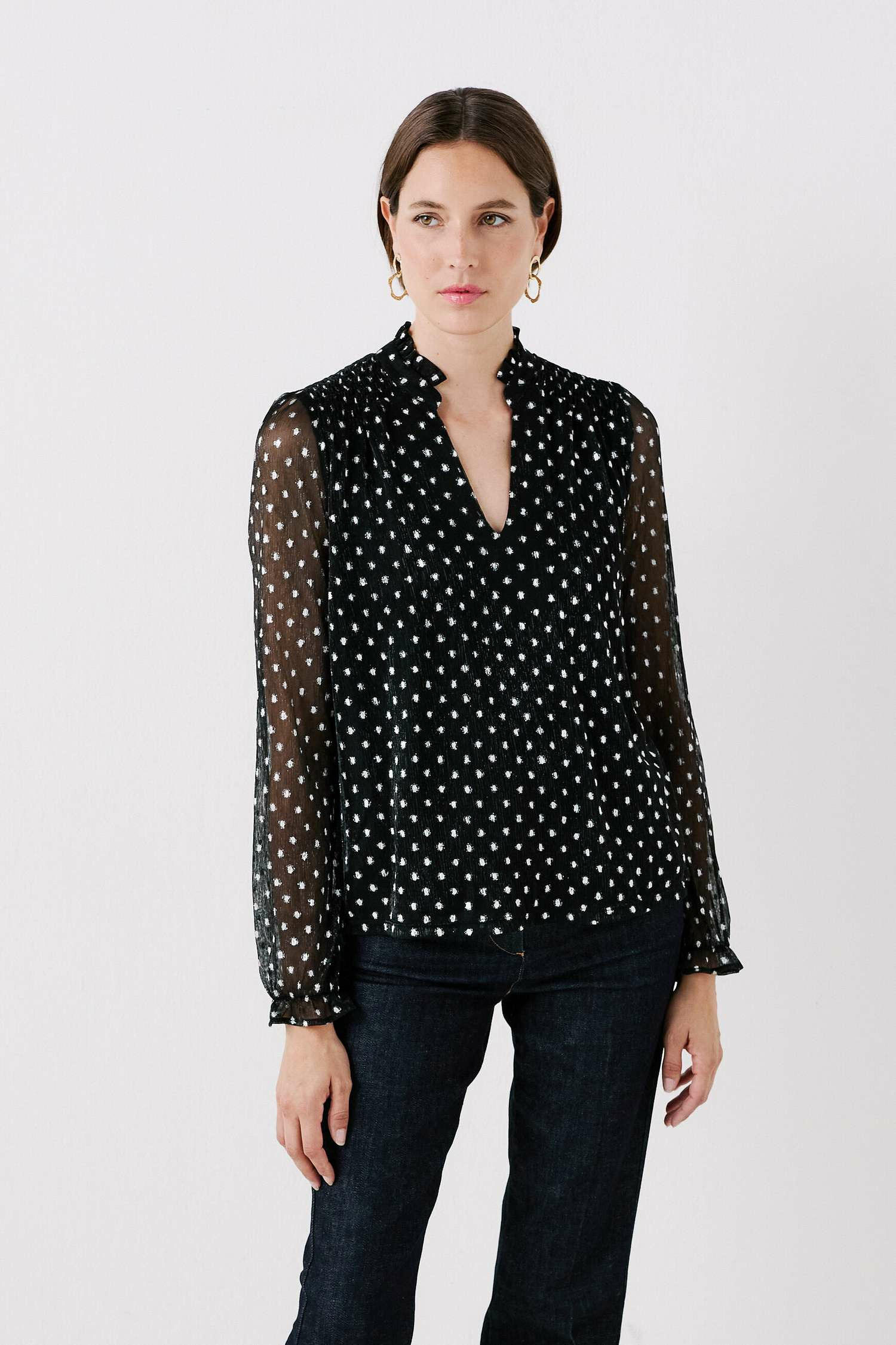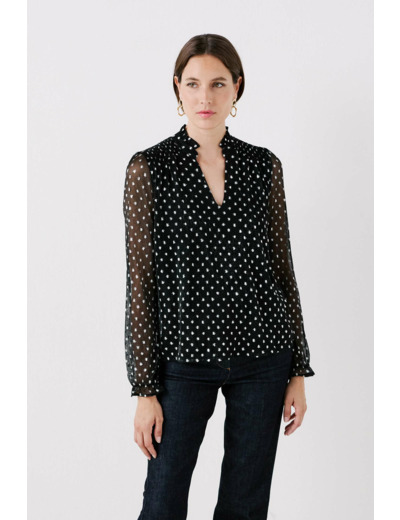 Grâce à sa composition en 100 % polyester associée à une coupe droite, le t-shirt tiltana2 vous assure un porté ultra léger. Il se pare d'un motif à pois subtilement scintillant conférant une allure élégante. - Col tunisien - Manches longues - Longueur 60 cm pour une taille S - Fronces au col et aux poignets - Modèle doublé