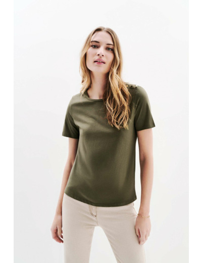 Ce t-shirt uni à la coupe droite est un classique intemporel, confectionné en 100% coton, une matière respirante pour un confort quotidien. - Col rond - Manches courtes - Longueur, 60 cm pour une taille S - Boutons décoratifs dorés en métal martelé sur l'épaule
