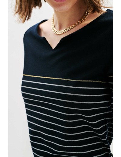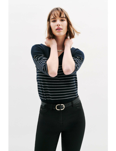 Le t-shirt tolympia mêle l'atout super féminin du col tunisien au motif marinière pile dans la tendance mode du moment : une pièce qu'on adopte au premier coup d'œil et qu'on prend plaisir à marier au quotidien avec des pantalons droits, des jupes crayons et des jeans flare ainsi qu'avec des vestes ajustées. - T-shirt marinière coupe droite - Col tunisien - Manches 3/4 - Longueur, 60 cm pour une taille S