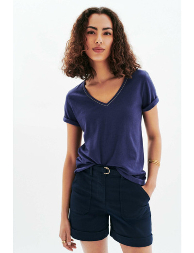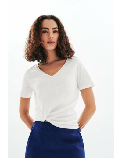 Le t-shirt Tpepe, un incontournable chic décontracté. Conçu en mélange de lin, il assure légèreté et confort. Sa coupe droite convient à toutes les morphologies. Pièce coup de coeur pour compléter votre garde-robe avec élégance. - T-shirt - Coupe droite - Col V - Manches courtes - Longueur 62 cm pour une taille S Idées look - Le t-shirt Tpepe se marie bien avec un short à revers et une ceinture fine. Complétez le look avec des sandales plates métalliques pour une allure décontractée. - Ce haut en mélange de lin s'associe joliment à un pantalon fluide taille haute et des mocassins en cuir. Ajoutez un blazer léger pour plus d'élégance. Conseil entretien Lavez votre t-shirt en mélange de lin à 30°C pour préserver la qualité de la maille. Le repassage est possible : il est recommandé à basse température, sans vapeur. Pour le séchage, privilégiez un séchage à l'air libre. Il est interdit d'utiliser le sèche-linge.