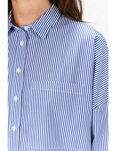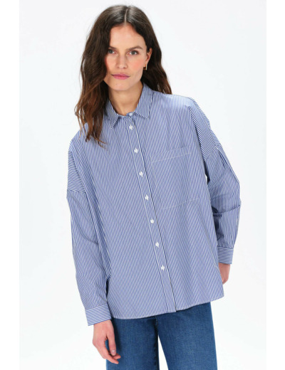 Cette chemise en coton est décorée d'un motif à fines rayures verticales. De coupe loose, elle est pourvue de manches longues, d'un col classique, de boutons de fermeture contrastants ainsi que d'une grande poche sur la poitrine. - 100% coton