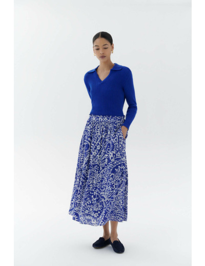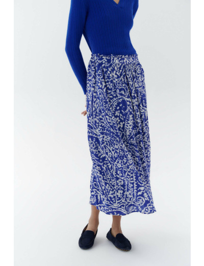 Composée à 100% de viscose pour un fin lisse et soyeux, la jupe midi jiam présente une coupe fluide et se pare d'un motif cachemire. - Taille élastiquée - Poches italiennes - Longueur, 85 cm pour une taille S - Doublure 100 % viscose