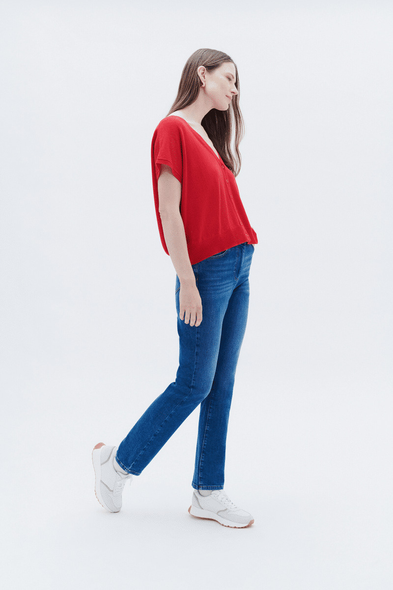 Intemporel, le jean est l’allié des tenues du quotidien. Le pantalon pdarwin en est une variante simple mais indémodable, grâce à sa coupe droite et son bleu profond, si caractéristique des jeans. Ses coutures orangées finissent de compléter ce look iconique.