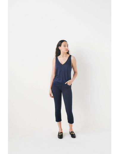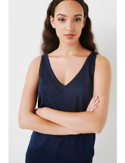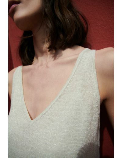 Débardeur en maille moulinée de fils Lurex. Une touche de brillance apportée à vos tenues. Faites pétiller vos looks working-girl en portant le débardeur en lin Nolwenn avec votre tailleur pantalon favori et illuminez vos silhouettes casual en associant ce top en maille à une jupe midi et une veste surchemise. - Débardeur col V à la coupe droite - Maille moulinée de fils Lurex - Finitions bord-côtes - Longueur, 57cm pour une taille S