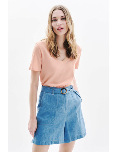 L'incontournable t-shirt à manches courtes, confectionné dans un jersey de lin et coton. Craquez pour son détail unique: un col V décoré d'un bord-côte doré apportant à vos looks une touche fantaisie et féminine. - T-shirt col V à la coupe droite - Encolure décorée d'un bord-côte doré - Longueur, 62 cm pour une taille S