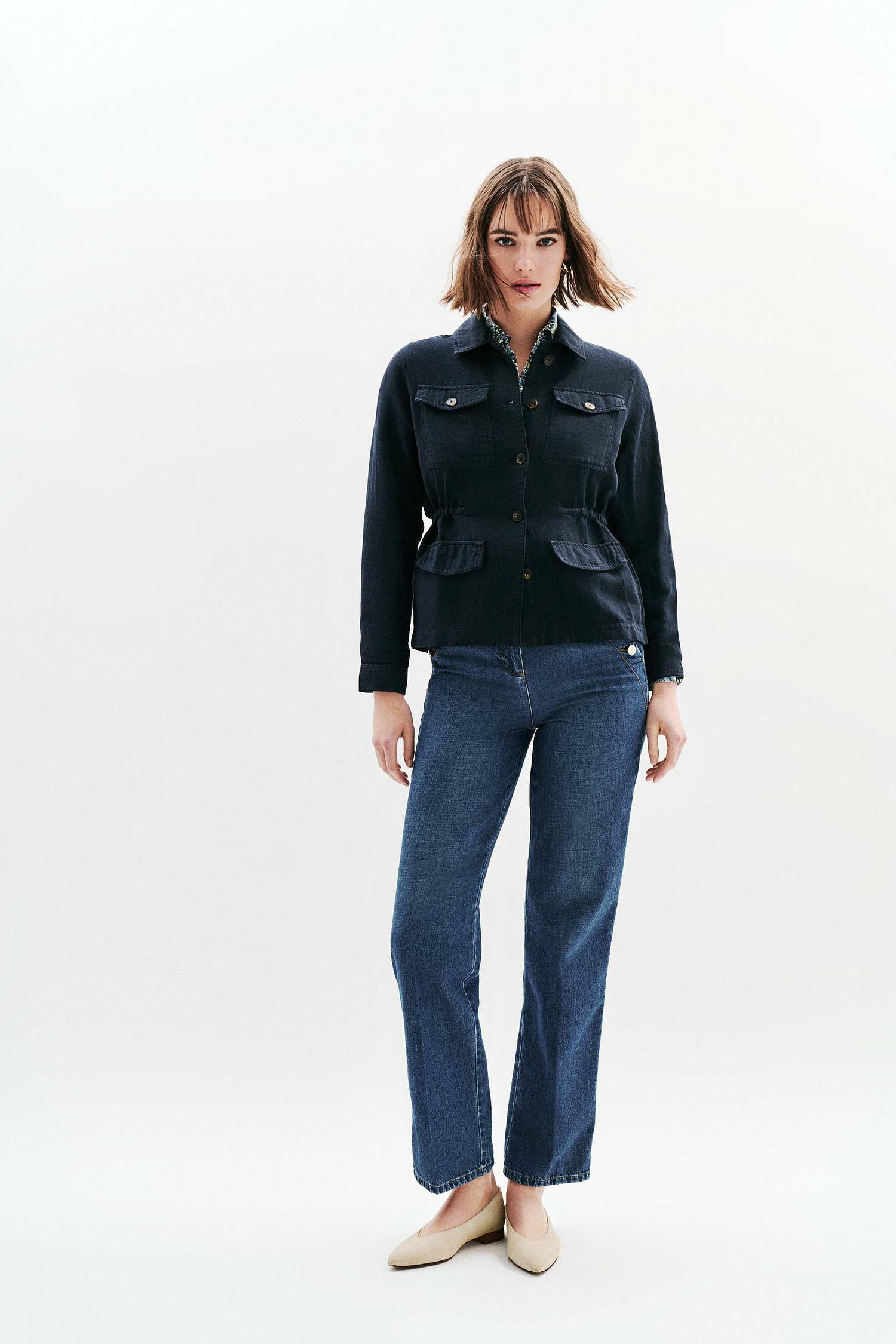 L'incontournable saharienne, confectionnée dans une toile de lin et coton pour une veste légère, idéale en entrée de saison. Imaginée dans des coloris très mode et facile à assortir, la veste Grace se porte droite et ouverte sur un t-shirt à message, ou fermée et appuyée à la taille grâce à des liens coulissants, pour arborer une silhouette féminine et structurée. - Veste à la coupe ajustable grâce à des liens coulissants cousus à l'intérieur de la veste - Modèle fermé par 5 boutons effet corne - Poches plaquées à rabat fermées par un bouton effet corne à la poitrine - Fausses poches à rabat à la taille - Poignets fermés par un bouton effet corne - Dessous de col, pied de col et doublure des poignets fantaisies - Longueur, 64 cm pour une taille 38