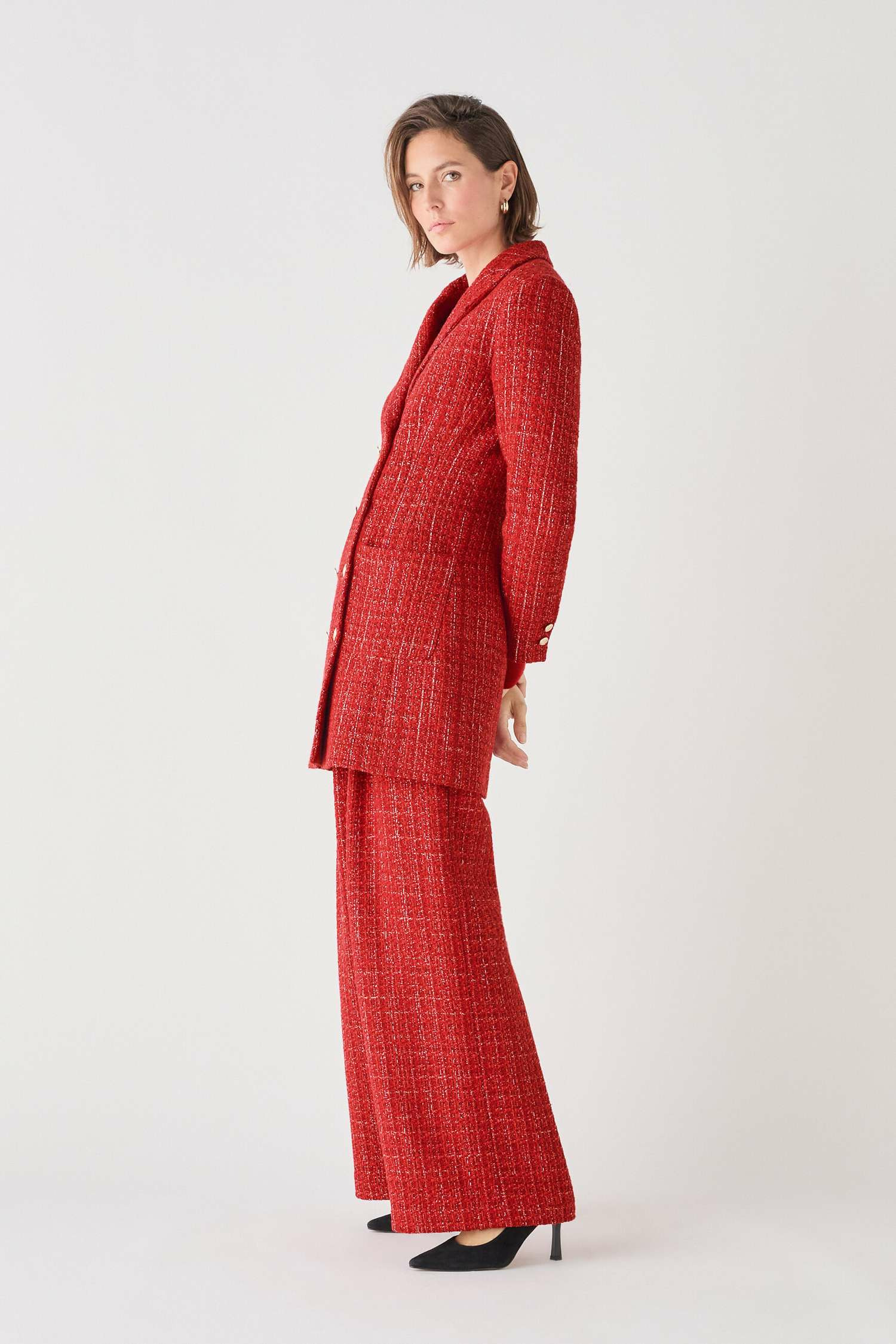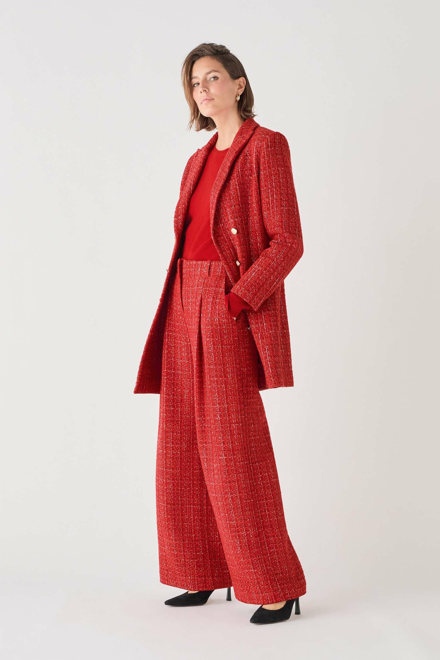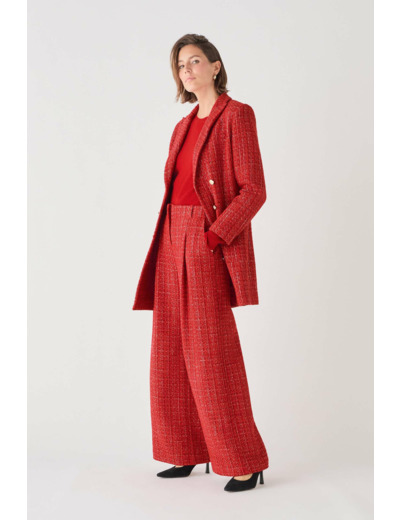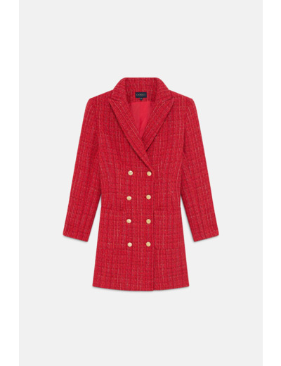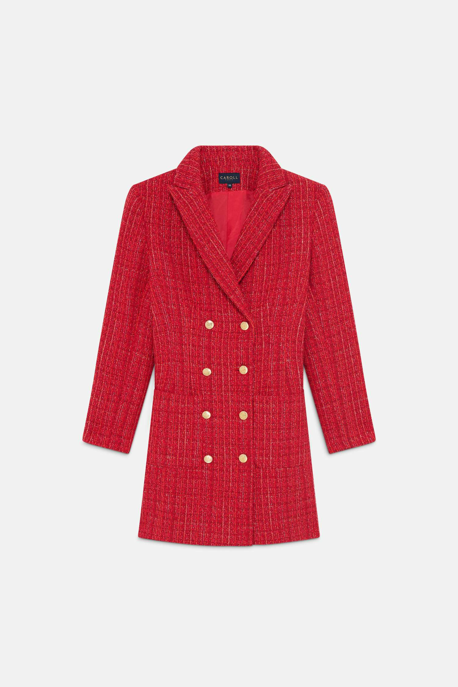 Cet hiver Caroll réinvente l'intemporel tweed. Chic et élégant, le tweed s'associe au rouge passion. Réhaussée par des touches brillantes d'argent et de doré, cette capsule se porte en total look ou mixée avec son dressing. Elegante et chaleureuse, la collection parfaite pour les fêtes de fin d'année ! La veste Vchristmasl apporte une touche chic à votre quotidien. Sa coupe droite convient à toutes les morphologies, à porter façon veste ou robe selon vos envies. - Coupe droite - Col tailleur - Manches longues - Longueur 82 cm pour une taille 38 - Fermeture boutonnée - Doublée - Peut être associée au pantalon Pchristmas ou la jupe Jchristmas Idées look - La veste Vchristmasl se marie bien avec un pantalon large en tweed pour une tenue élégante et coordonnée. - Ce blazer peut être porté avec des bottes hautes en cuir noir, ajoutant une touche moderne à l'ensemble. Conseil entretien Pour préserver la qualité de votre veste, il est interdit de la laver, que ce soit en machine ou à la main. Le repassage et l'utilisation du sèche-linge sont également interdits. Confiez toujours le nettoyage de cette pièce à un professionnel en pressing.