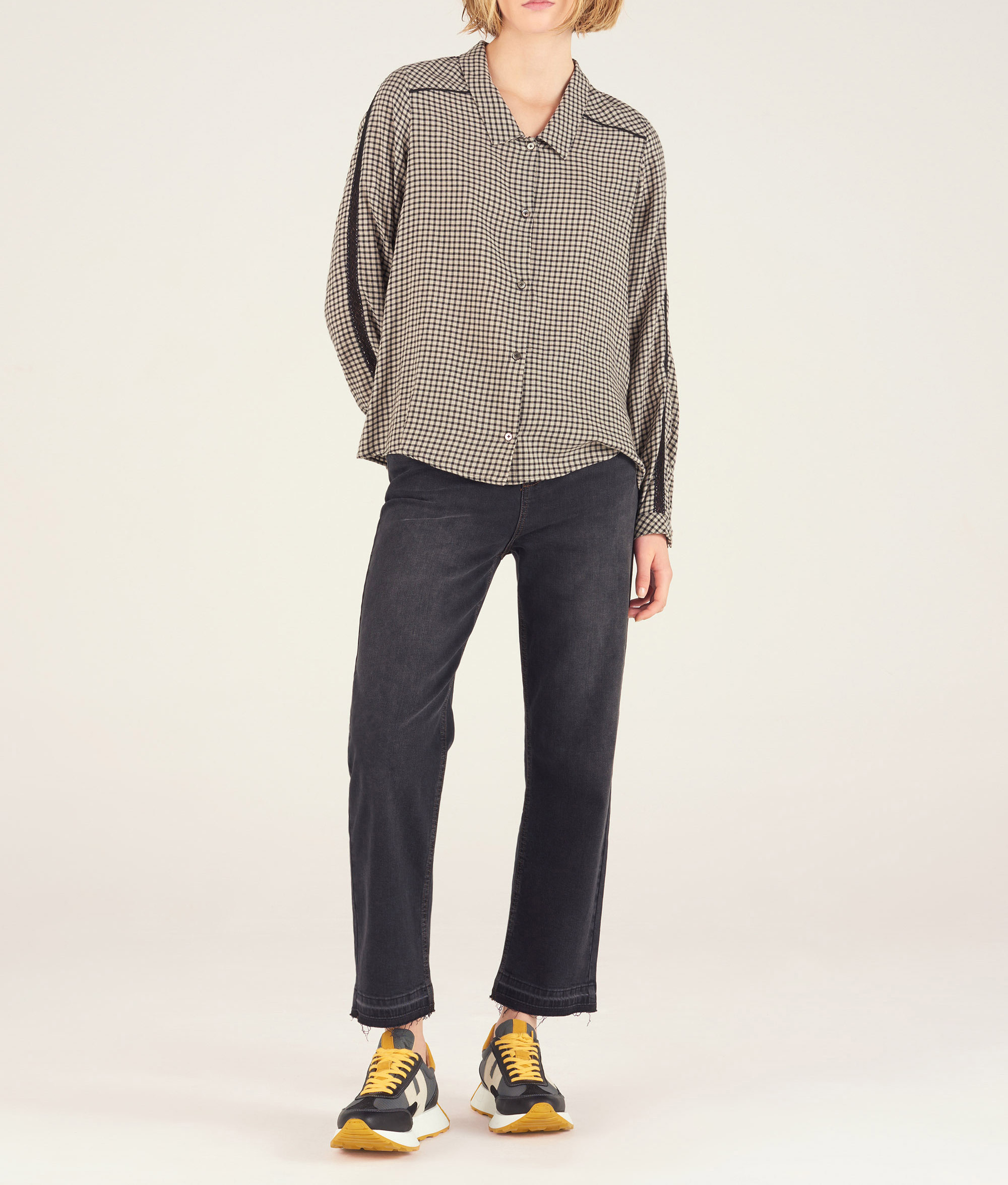 - Découpes soulignées avec un passepoil noir, devant et dos