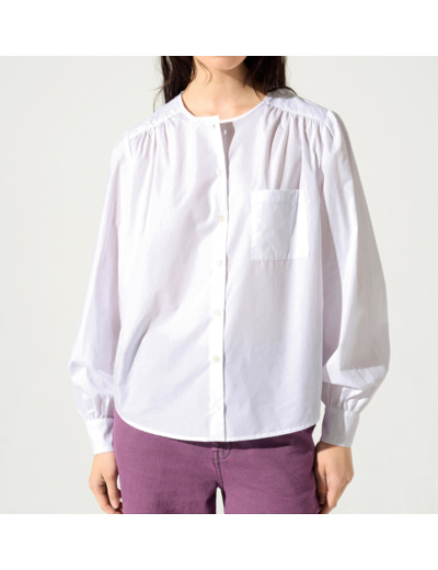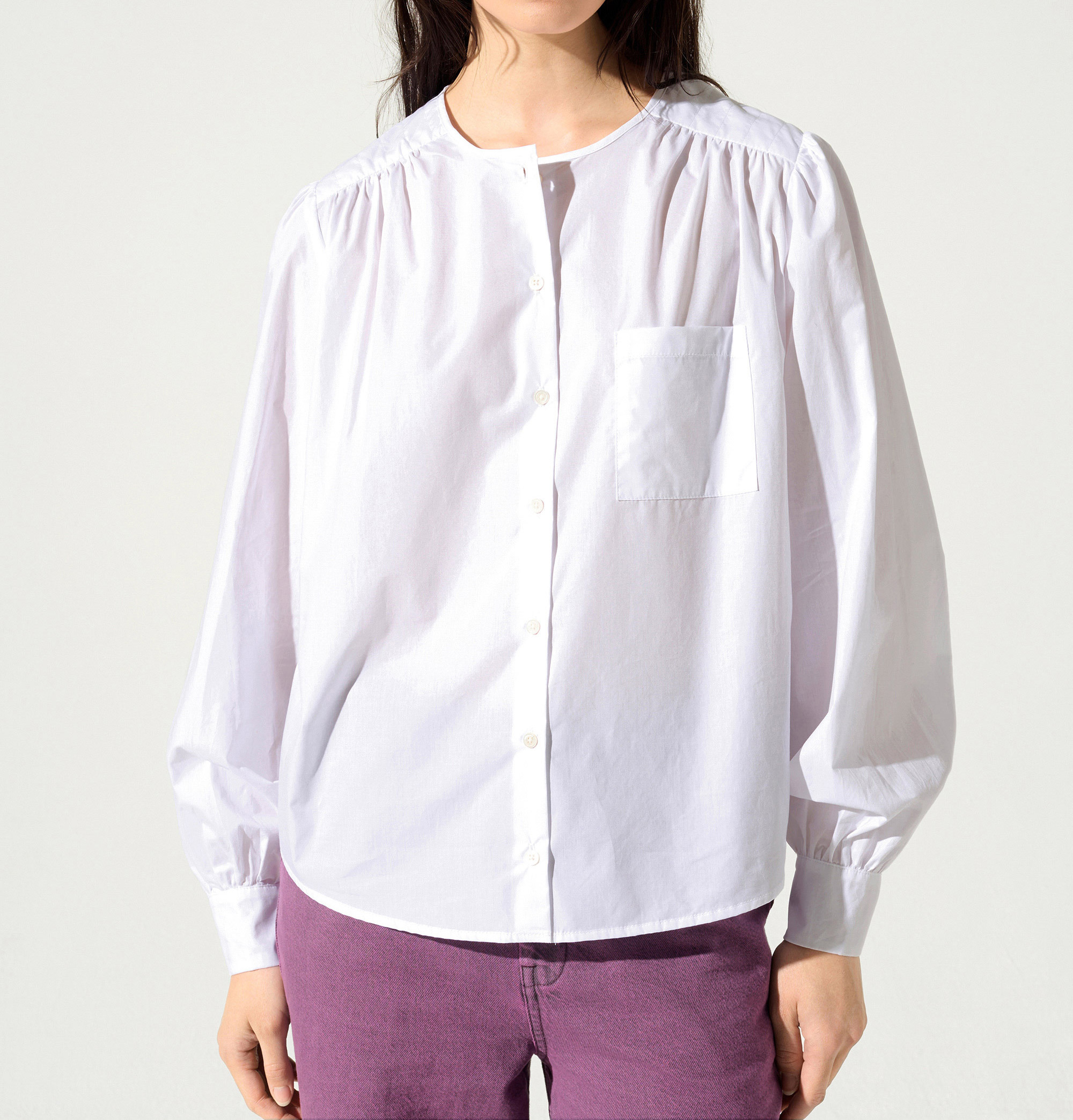 • Caractéristiques clés : Blouse ample à manches longues blousantes, boutonnée sur le devant ainsi que sur les poignets. Vous aimerez sa poche plaquée à la poitrine ainsi que son empiècement de tissu matelassé aux épaules.