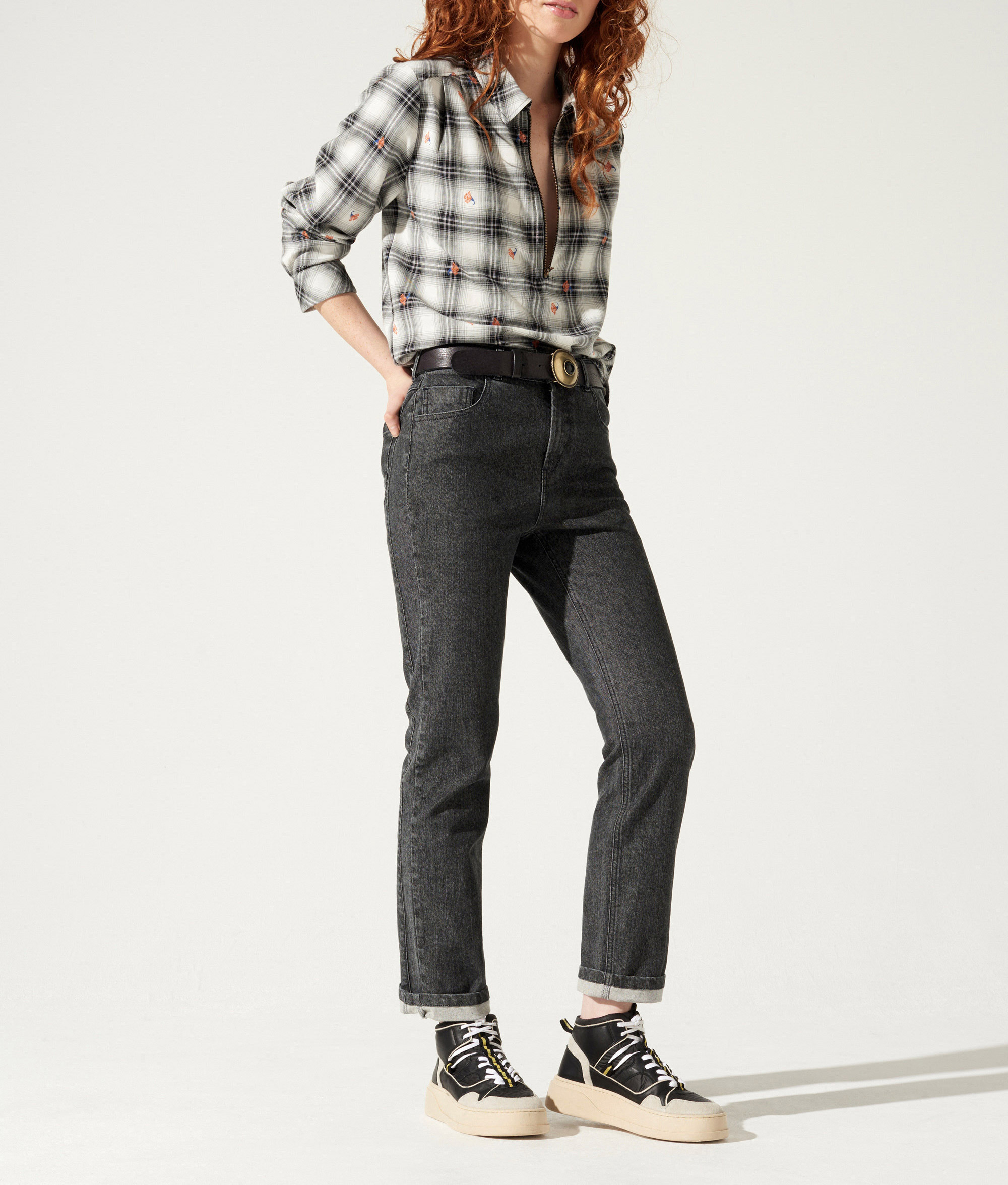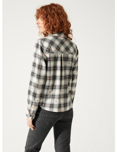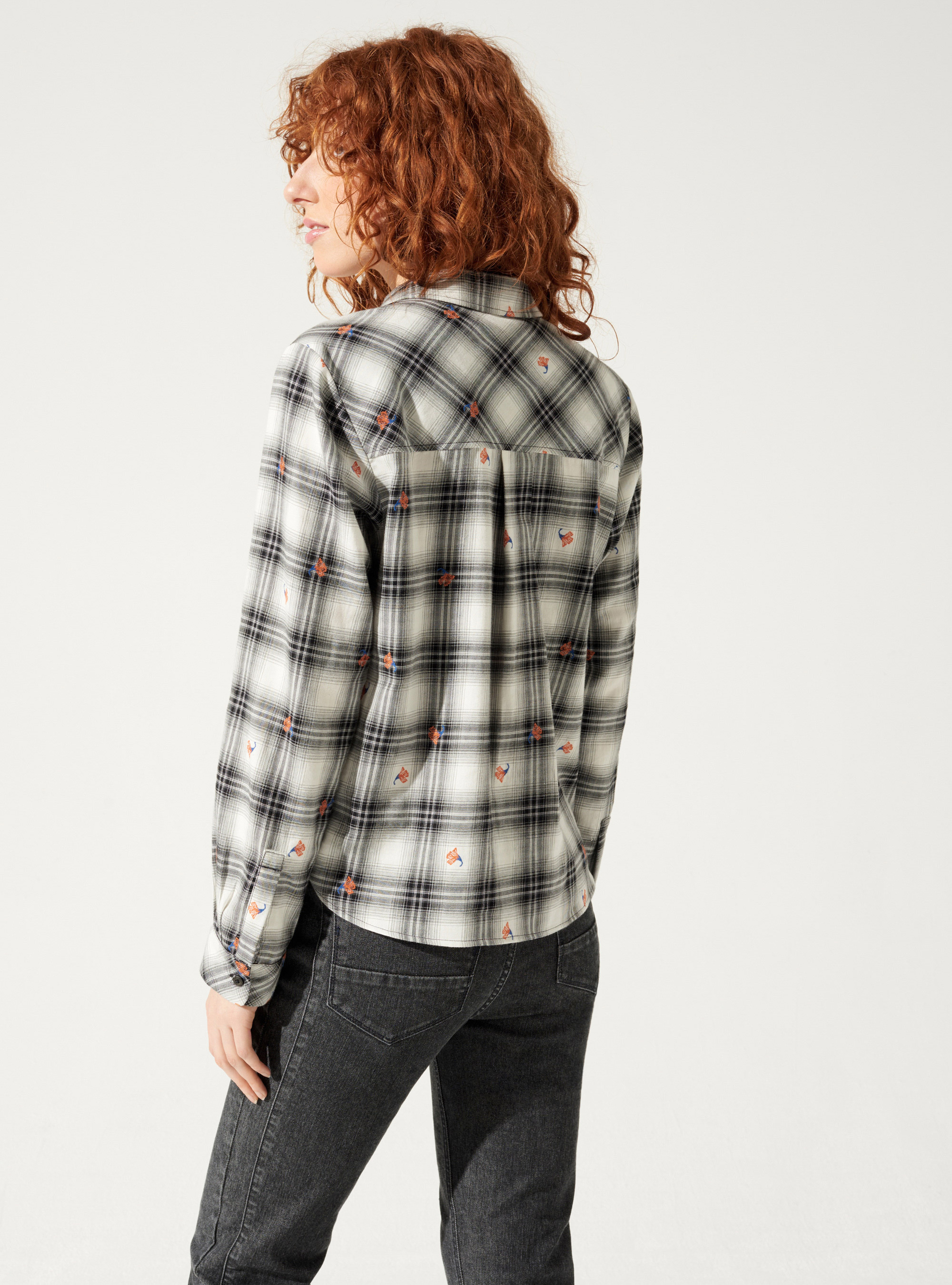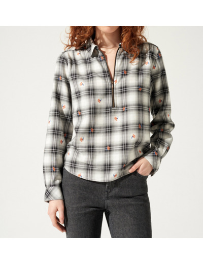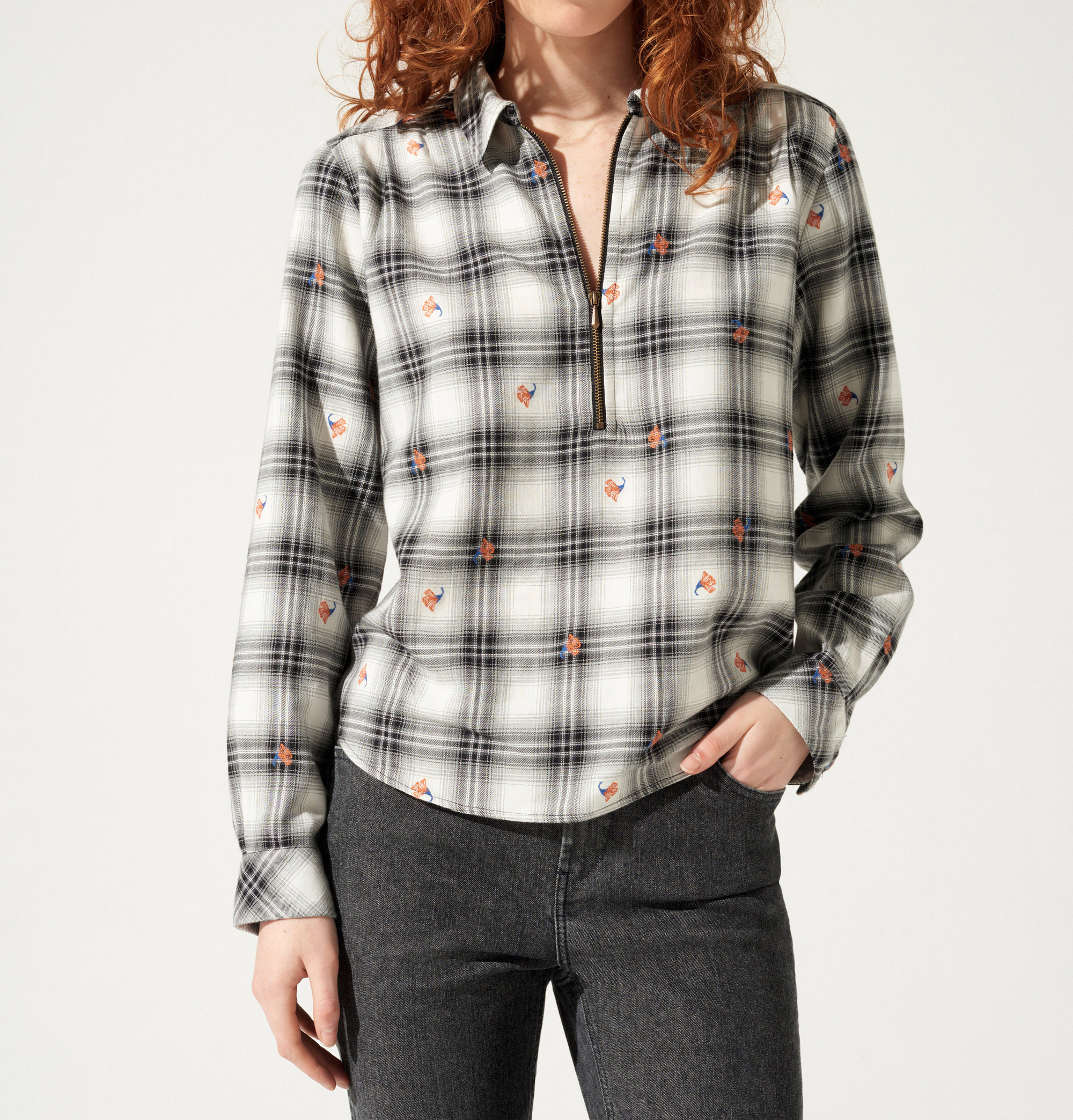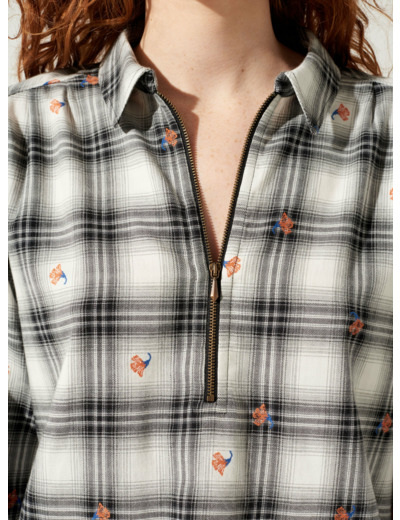 • Caractéristiques clés : Blouse droite avec col chemise à ouverture zippée et pli rond dans le dos. Les poignets sont boutonnés et présence d'un détail de fronces sur les épaules. Mix de carreaux et de fleurs en tissé teint. Main douce et aspect gratté.