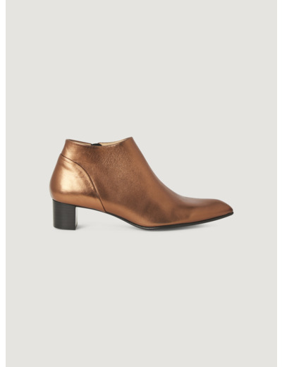 • Caractéristiques clés : Bottines longues et pointues en cuir irisé bronze. Son talon Louis XV de 4 cm, déporté sur l'arrière, est enrobé de cuir et permettra un confort optimal quotidien. Le zip intérieur permet d'enfiler les bottines facilement.