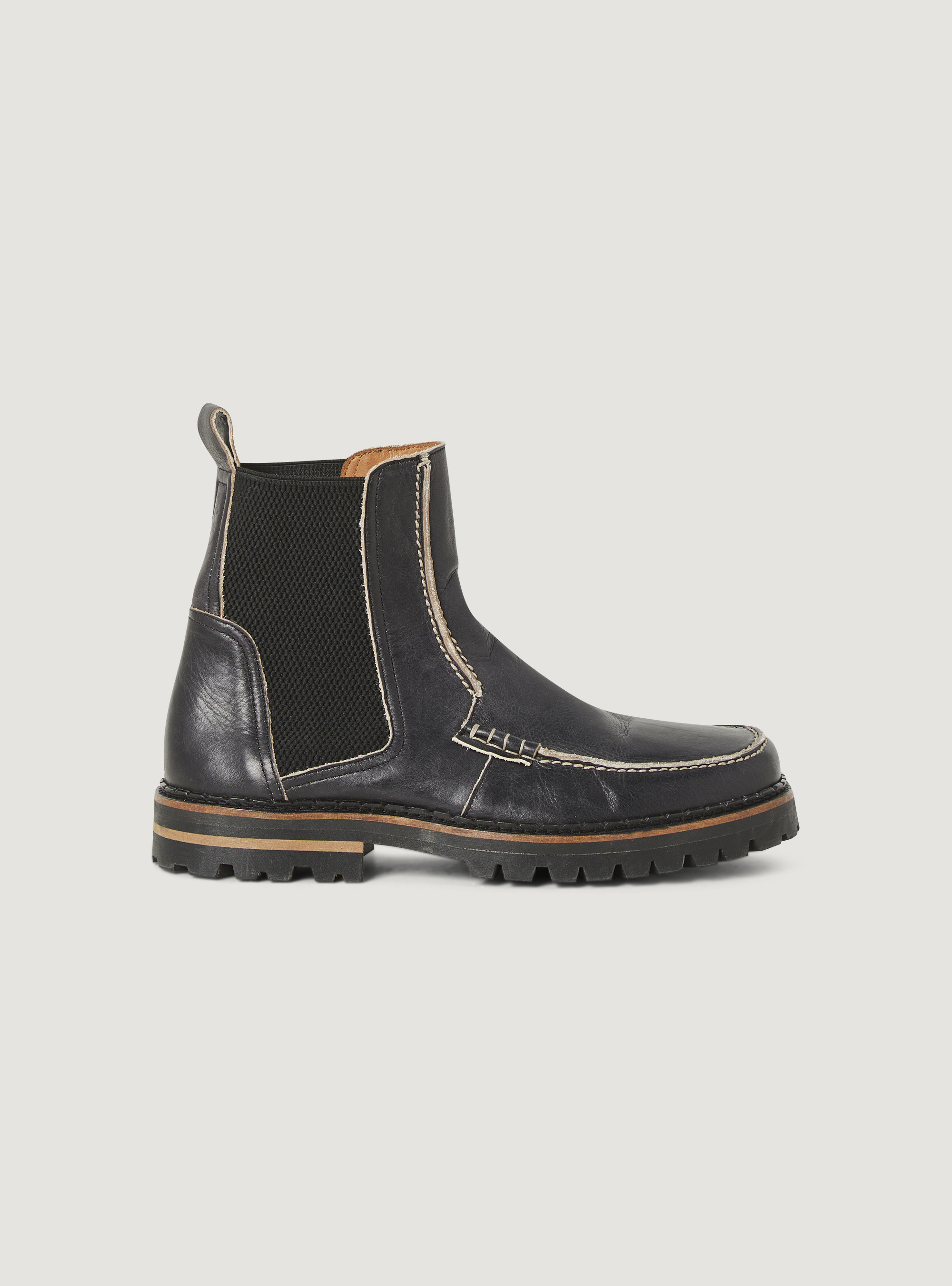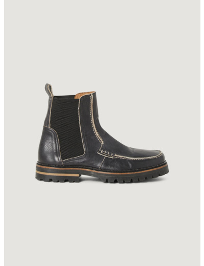 • Caractéristiques clés : Bottines en cuir lisse noir et à la forme carrée avec plateau cuir bord franc. Son élastique sur les côtés permet un enfilage optimal. Détails de piquage sellier contrasté et de tranches naturelles contrastées sur le cuir. Semelle en caoutchouc bicolore, crantée, avec trépointe tout le tour. Talon de 3 cm pour une cambrure de 1 cm.