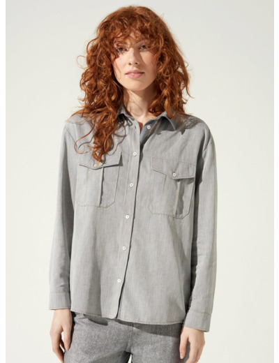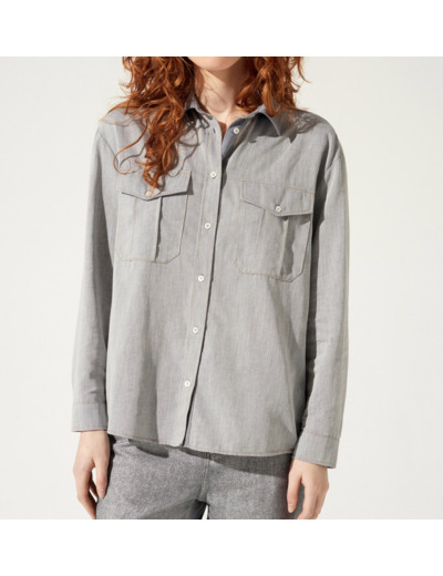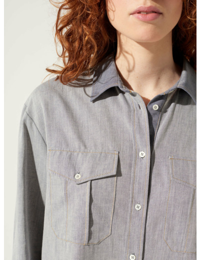 • Caractéristiques clés : Chemise droite à manches longues boutonnées au niveau des poignets ainsi que sur les rabats des poches plaquées sur la poitrine. Vous aimerez son détail de tissu envers/endroit en contraste ainsi que le pli rond dans le dos. Matière 100% coton façon chambray : idéale pour les beaux jours avec sa toile légère et respirante.