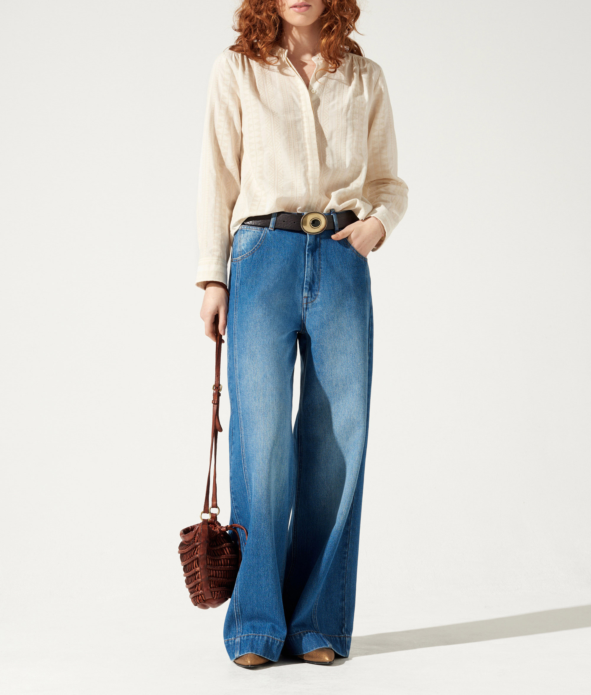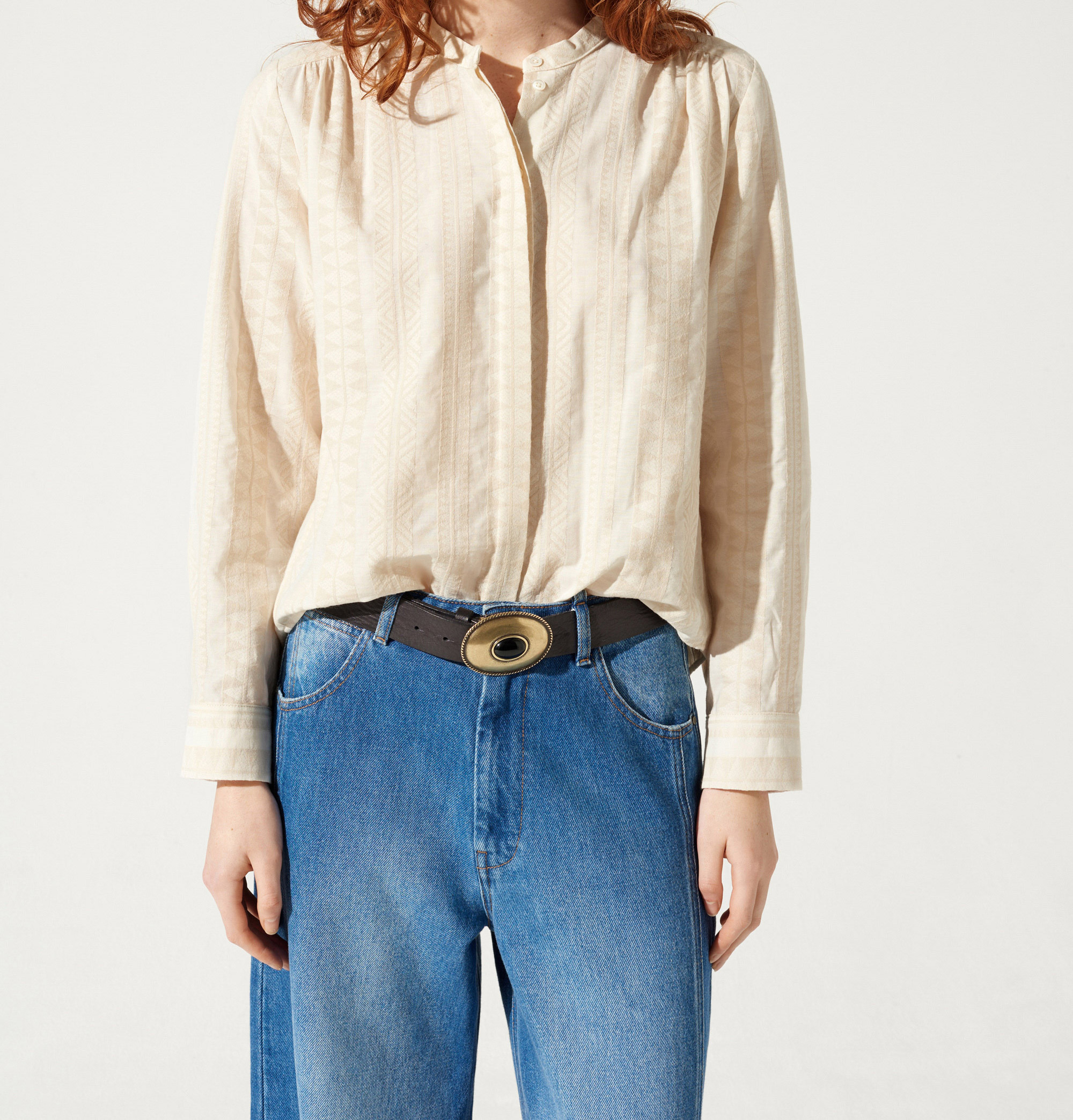 • Caractéristiques clés : Chemise coupe droite à manches longues avec poignets boutonnés et col Mao. Vous serez séduite par les détails de fronces au niveau des épaules et dans le dos, ainsi que le subtil jacquard de coton en ton sur ton pour un style bohème raffiné.