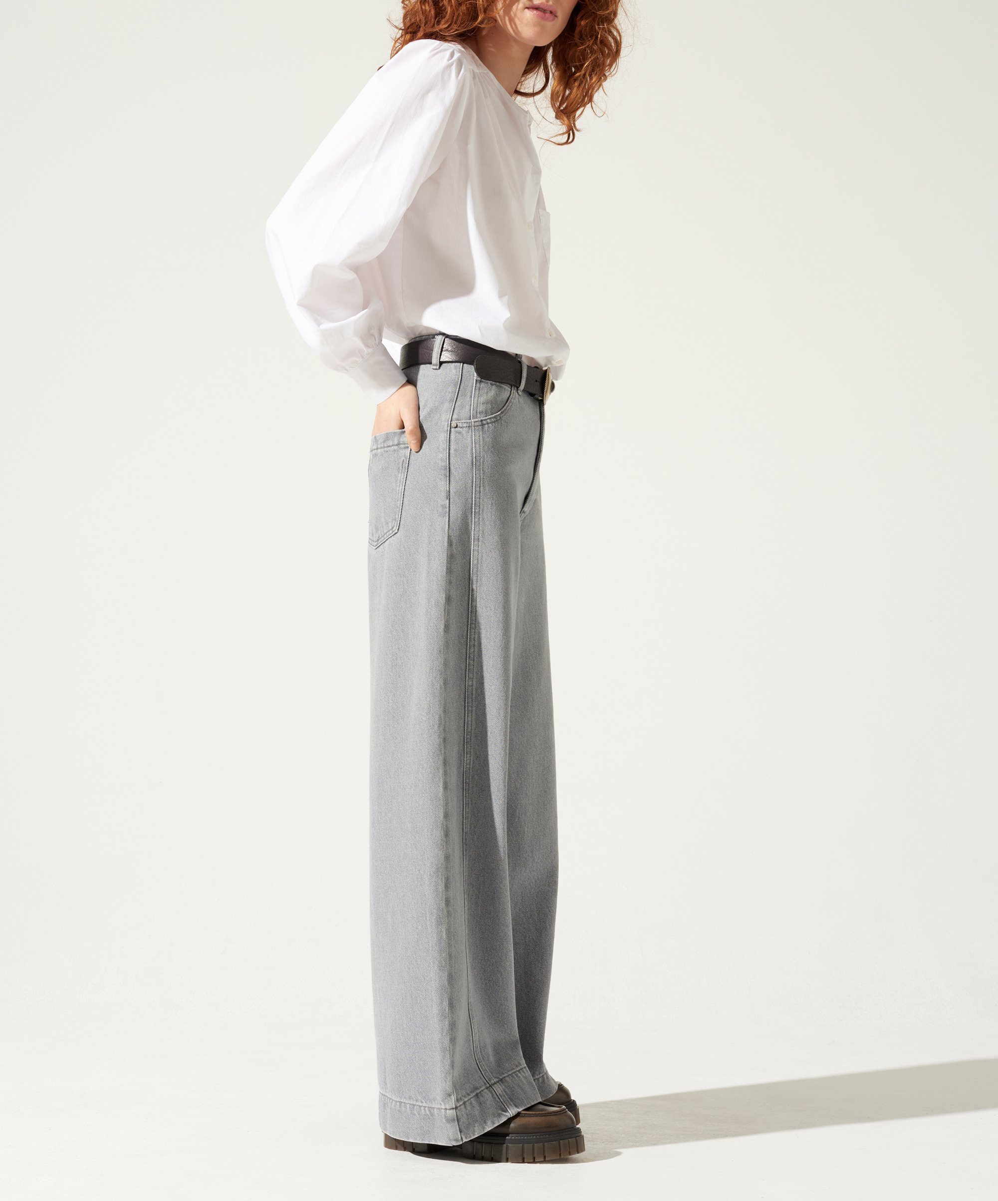 • Caractéristiques clés : Jean large à taille haute en toile denim 100% coton avec jacron cuir au dos.
