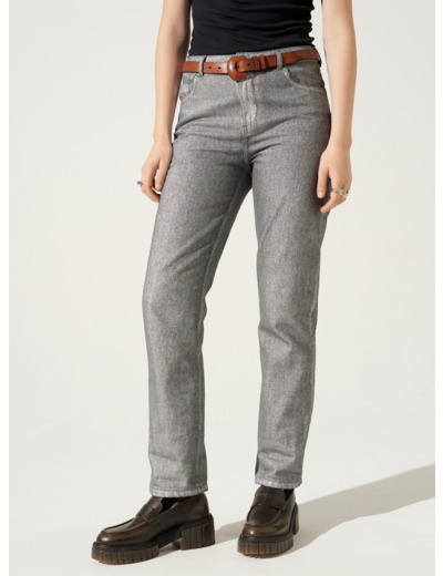 • Caractéristiques clés : Jean droit ajusté, taille haute et longueur chevilles. Matière en toile denim épaisse 100% coton qui souligne et allonge la jambe, renforcé par les découpes côtés. Un enduit argenté est appliqué sur la toile pour lui donner cet aspect subtilement brillant. Jacron en cuir au dos.