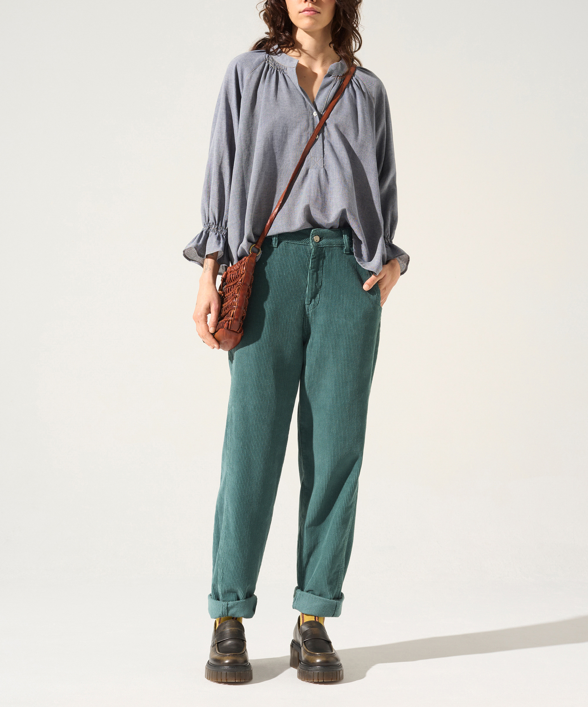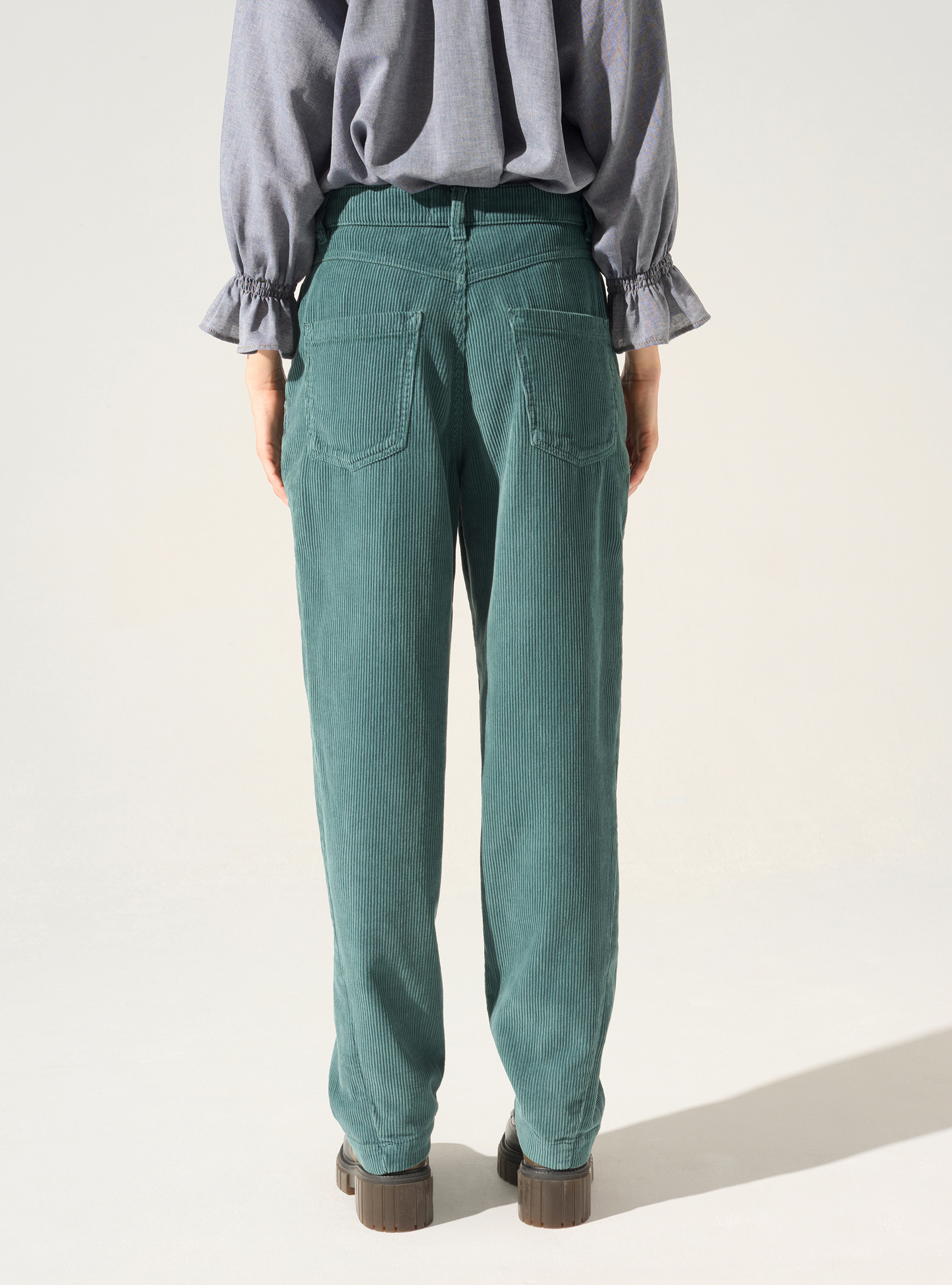 • Caractéristiques clés : Pantalon coupe mom longueur cheville à grosses côtes de velours, 100% coton.
