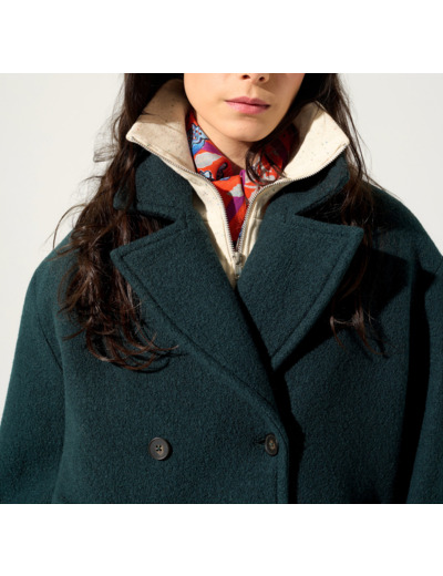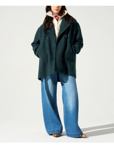 • Caractéristiques clés : Manteau caban ample avec double boutonnage croisé et large col à revers crantés. Caban 100% laine bouillie entièrement doublé, au coloris profond et élégant.