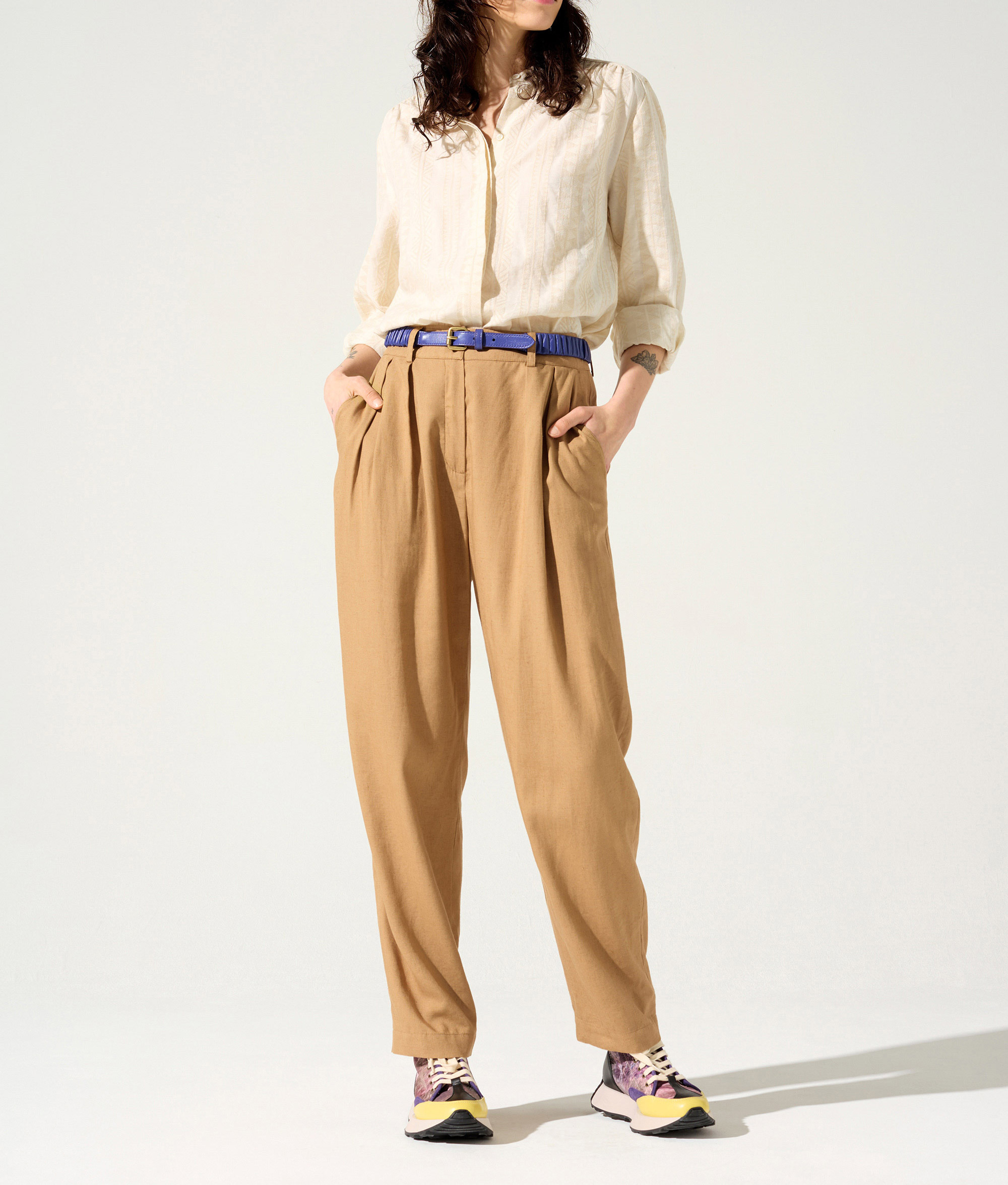 • Caractéristiques clés : Pantalon coupe carotte longueur cheville et taille haute : idéal pour affiner votre silhouette. Vous aimerez ses poches italiennes à l'avant et celle passepoilée au dos ainsi que les plis creux sous la ceinture qui donnent un style casual raffiné.