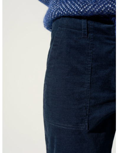 • Caractéristiques clés : Pantalon droit à la coupe ajustée, taille haute et longueur 7/8ème. Poches italiennes et passepoilées au dos.