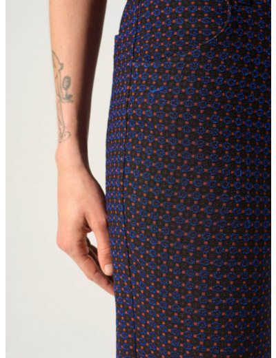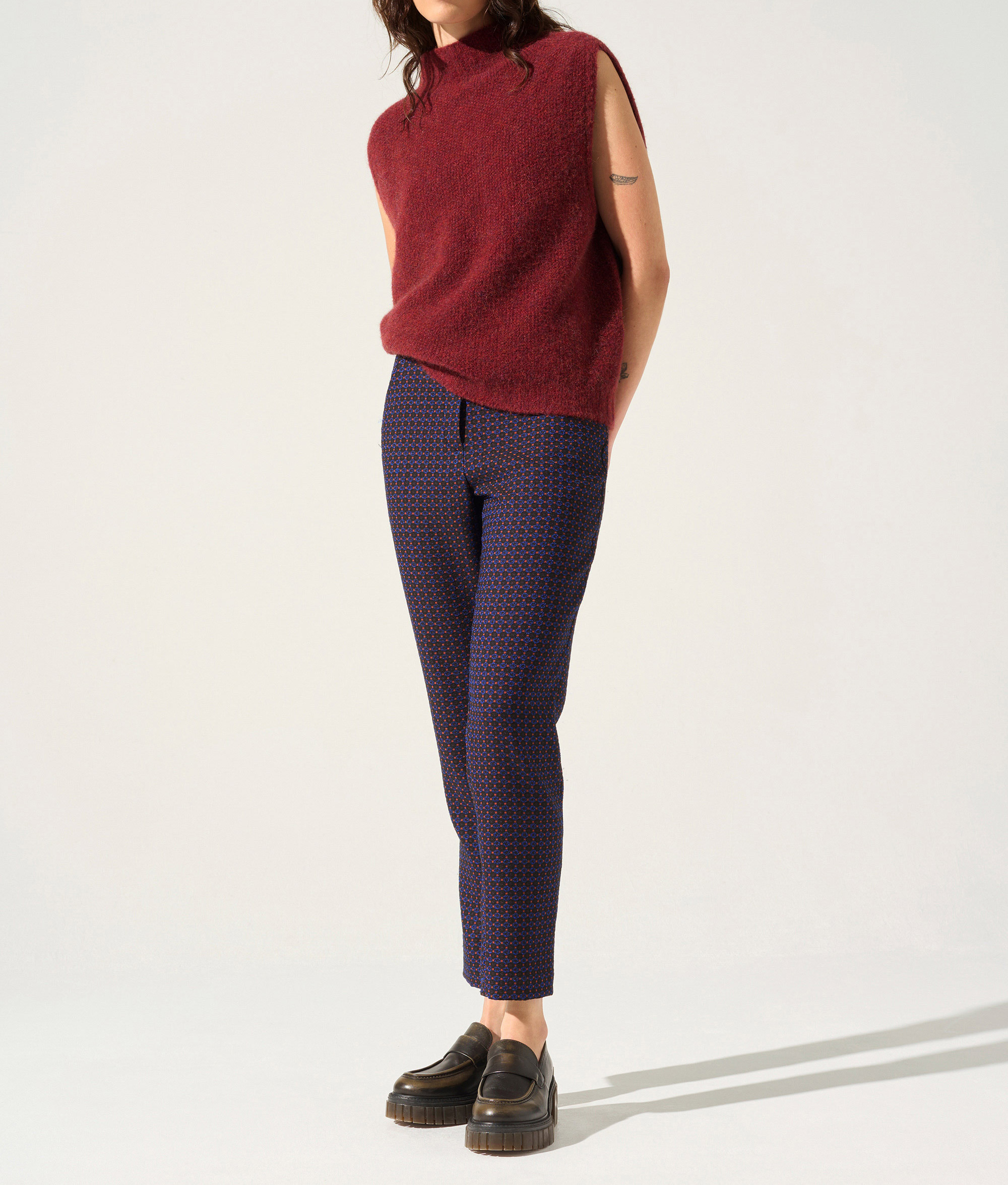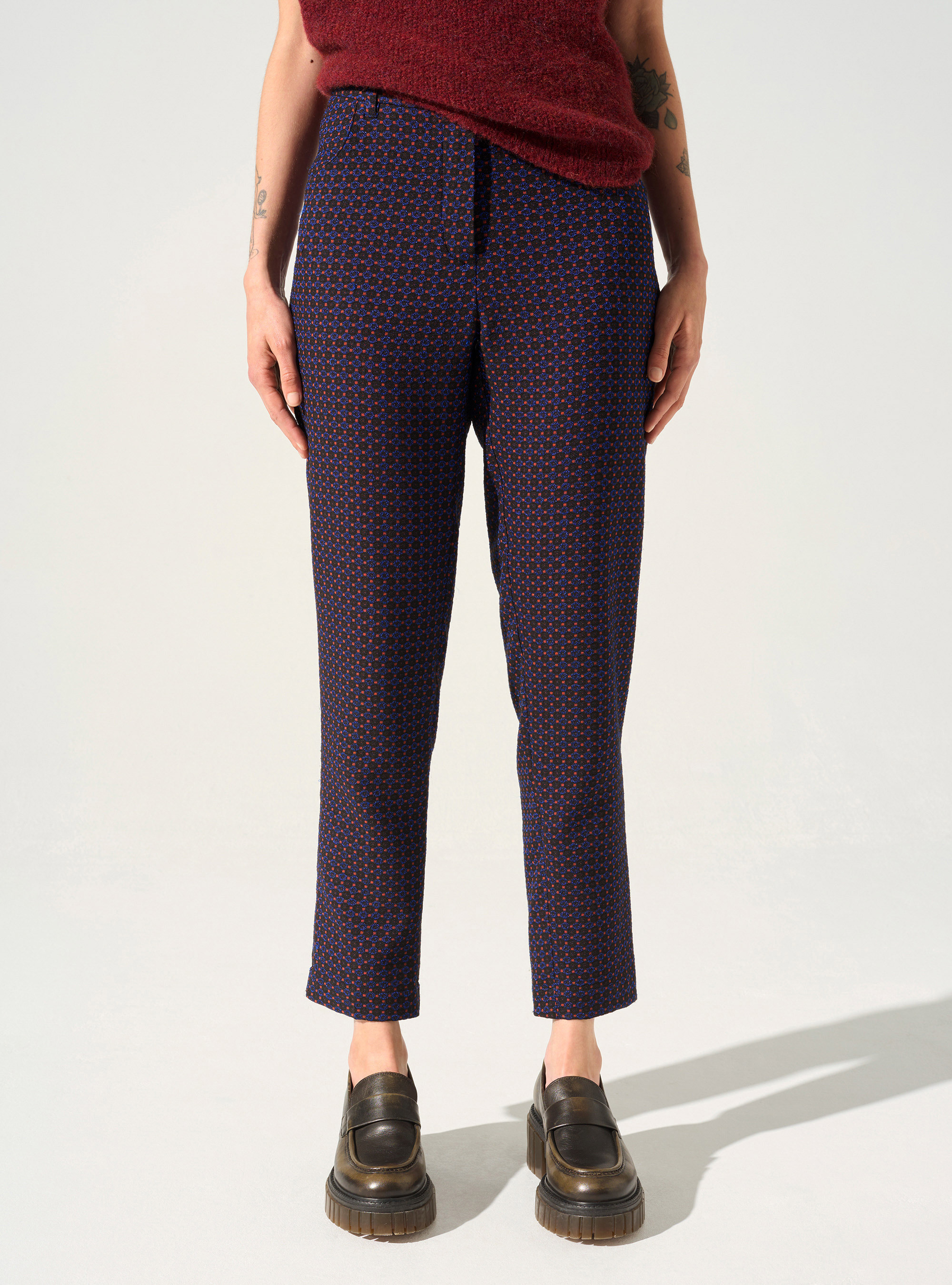 • Caractéristiques clés : Pantalon droit 7/8ème avec poches côtés et ouverture boutonnée et zippée. Une pièce originale avec son petit jacquard cravate, à porter de façon fun et décalée avec du jean, ou en total look assumé.
