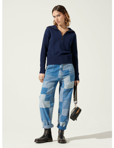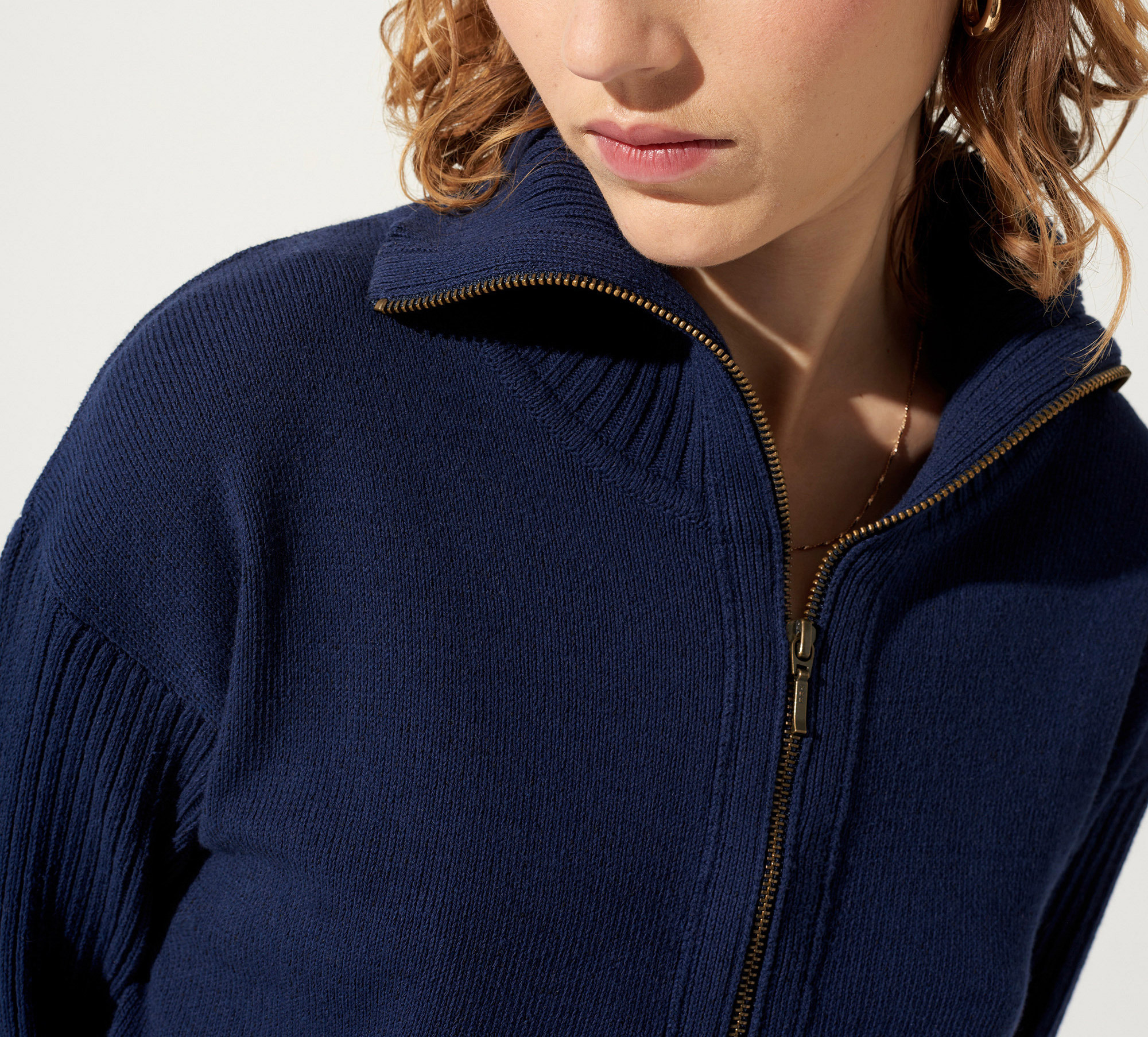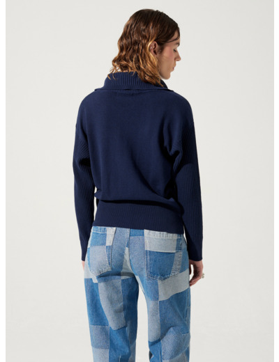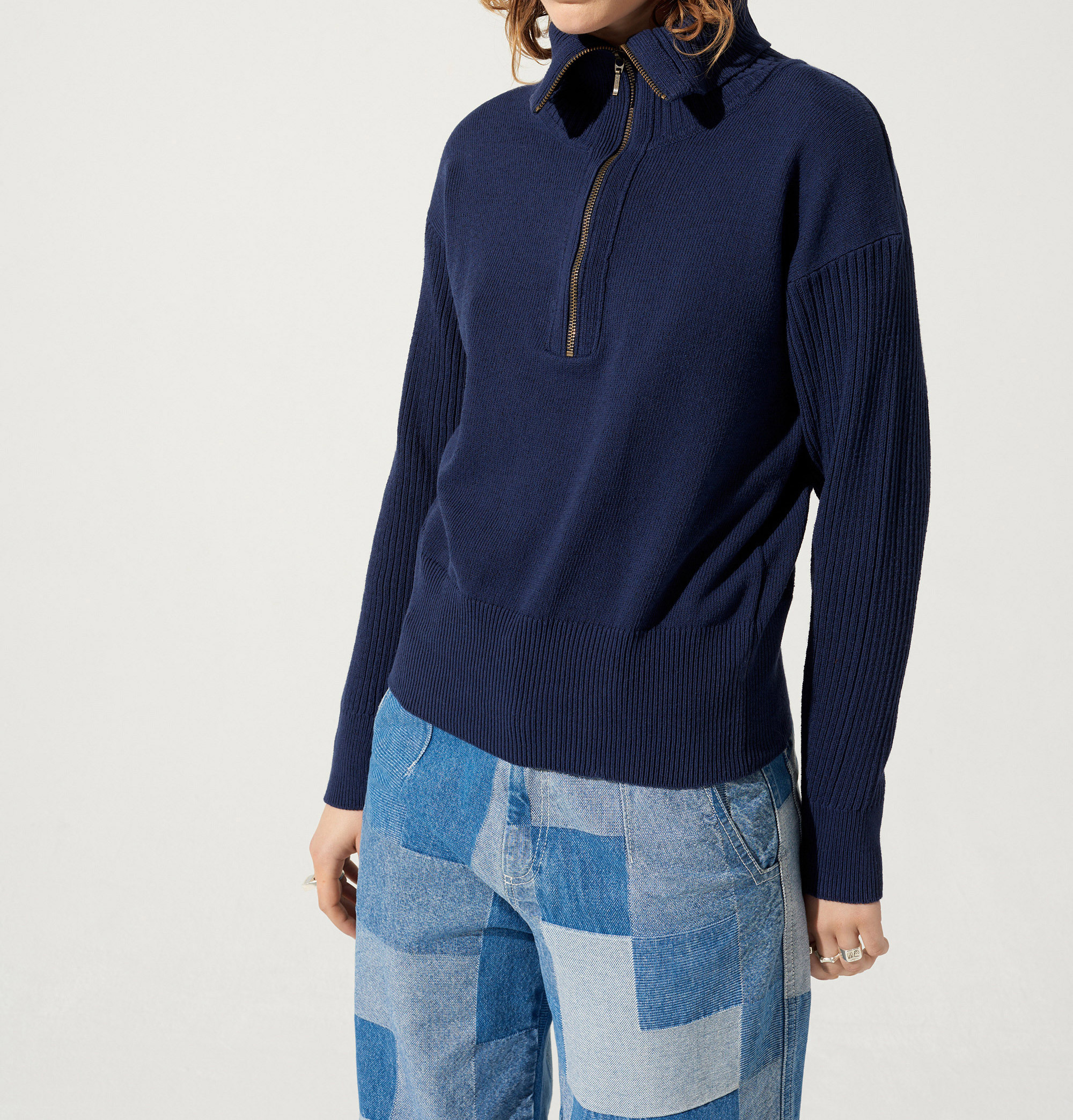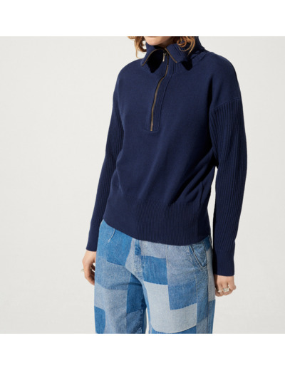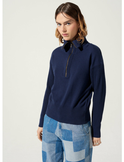 • Caractéristiques clés : Pull au volume ajusté dont le col camionneur se termine par un zip à porter ouvert ou fermé selon les envies. Vous aimerez sa maille côtelée en matières recyclées et son jeu de tricotage entre maille et jersey.