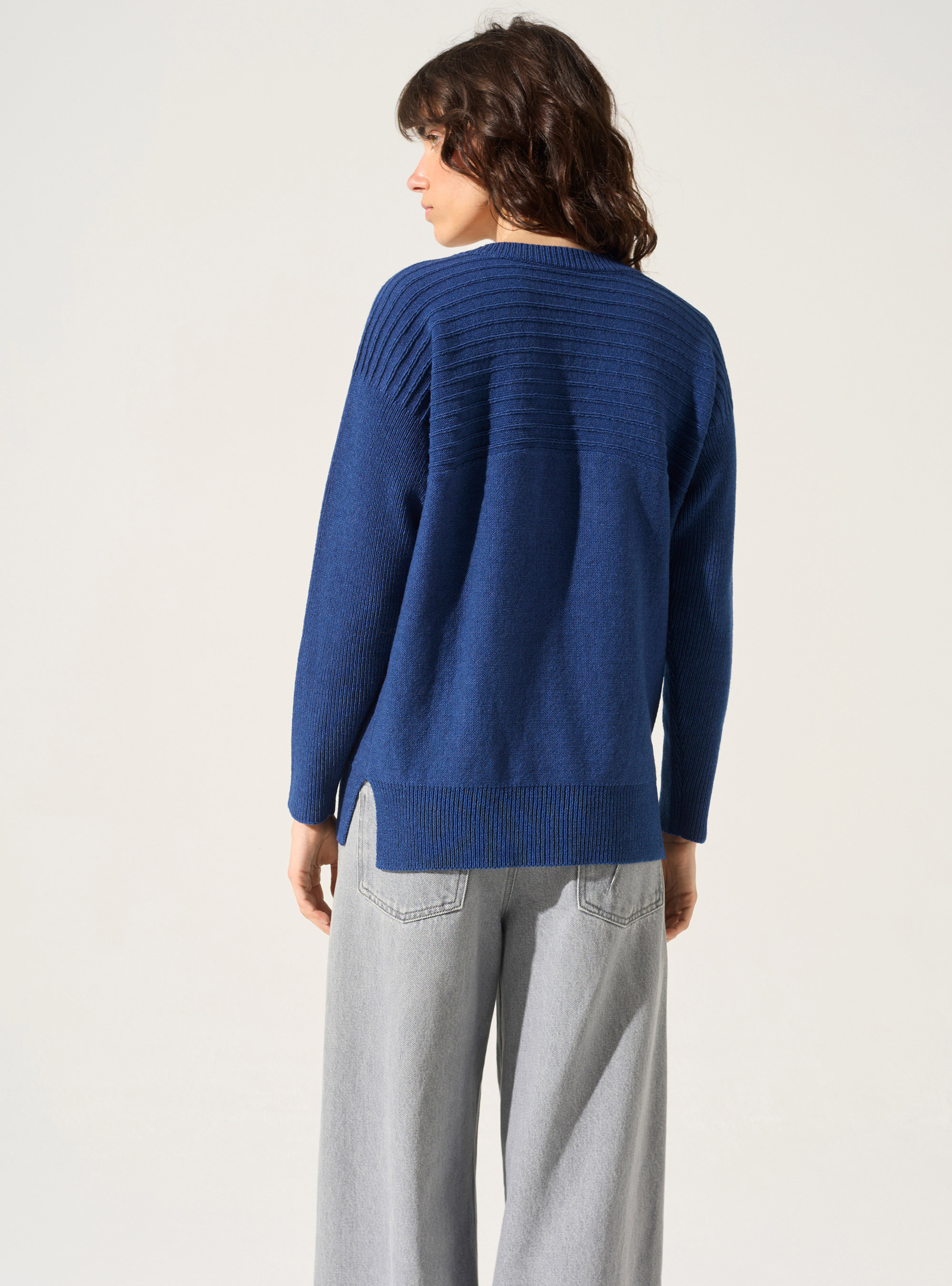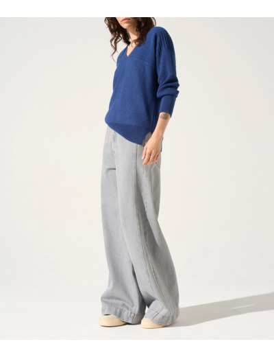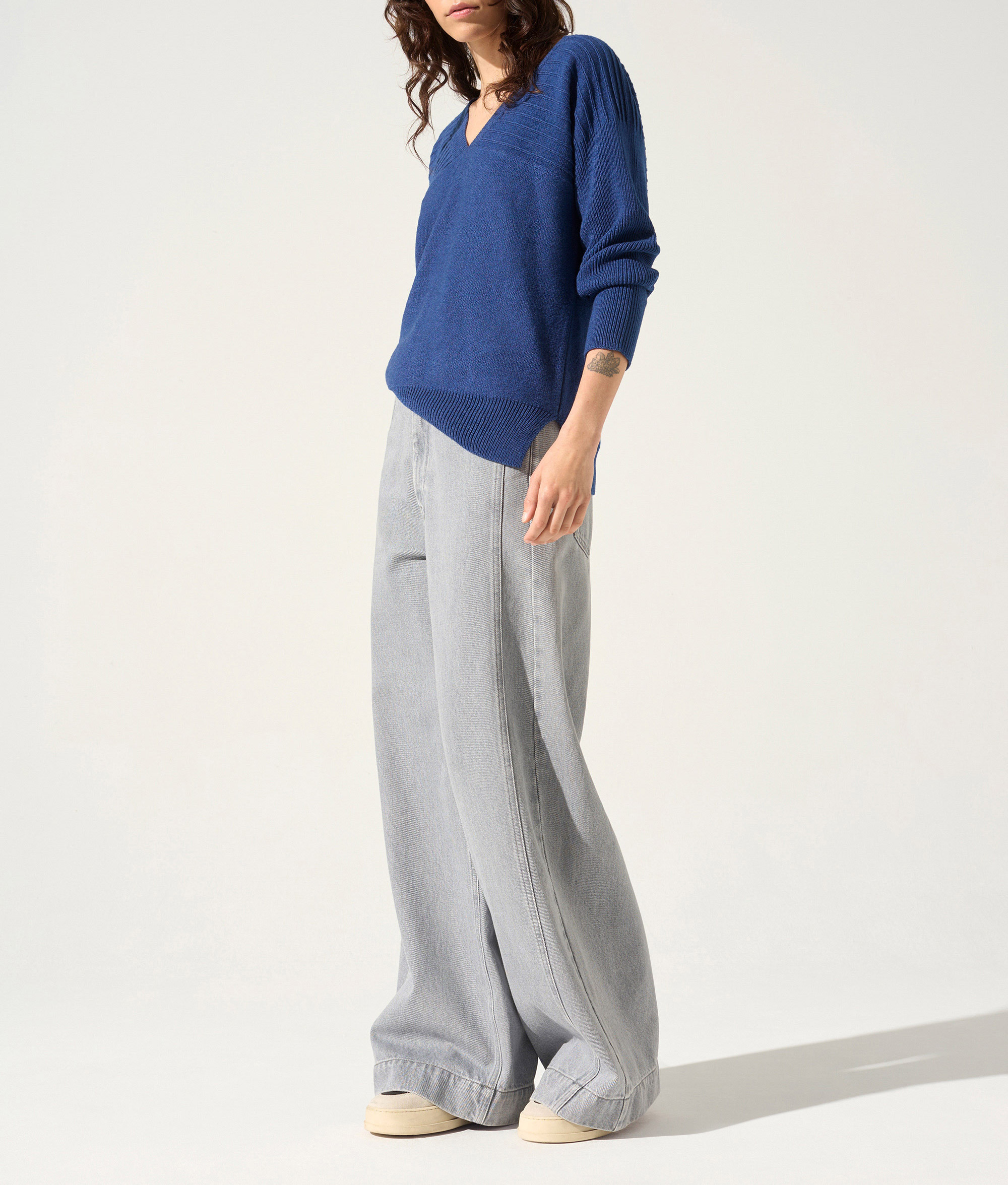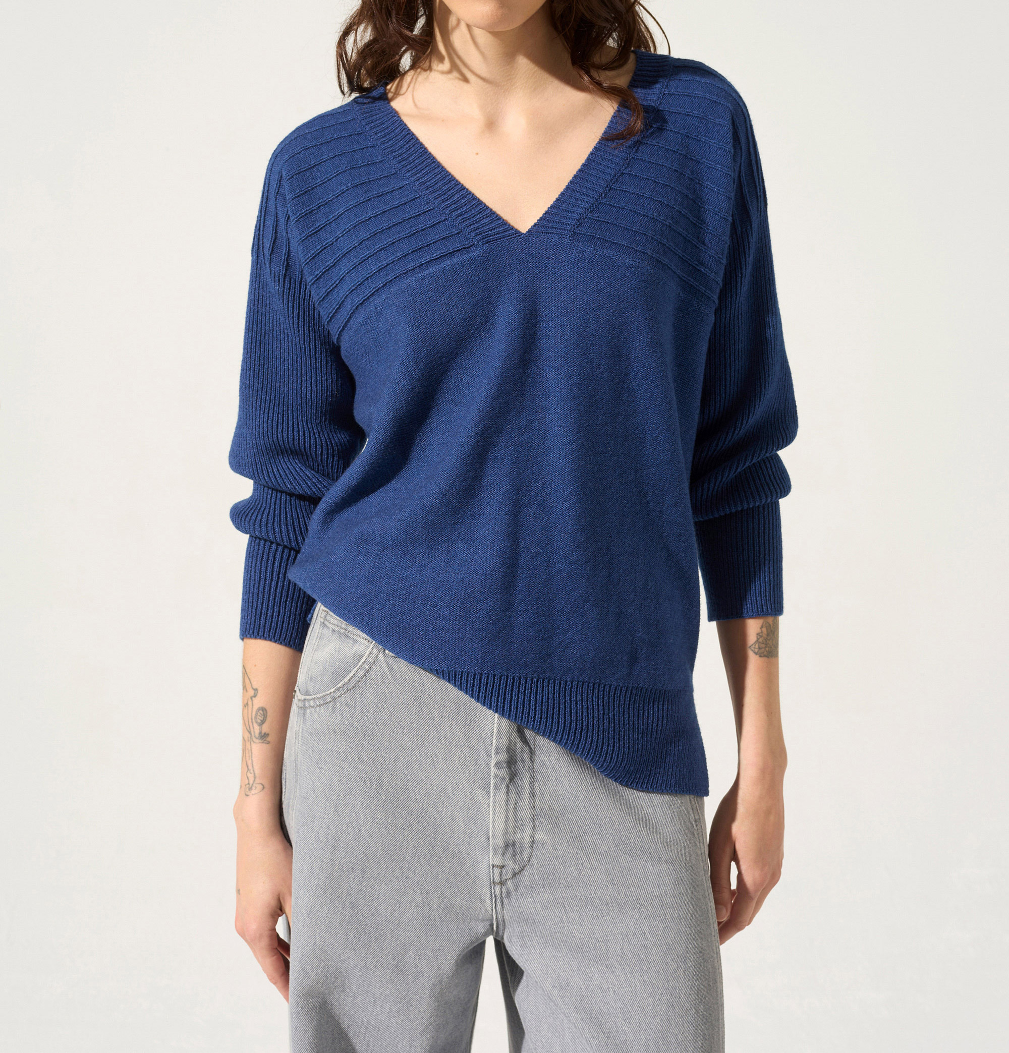 • Caractéristiques clés : Pull à col en V et au volume droit qui vous séduira avec son jeu de côte sur le col et les manches ainsi que ses fentes sur les côtés.
