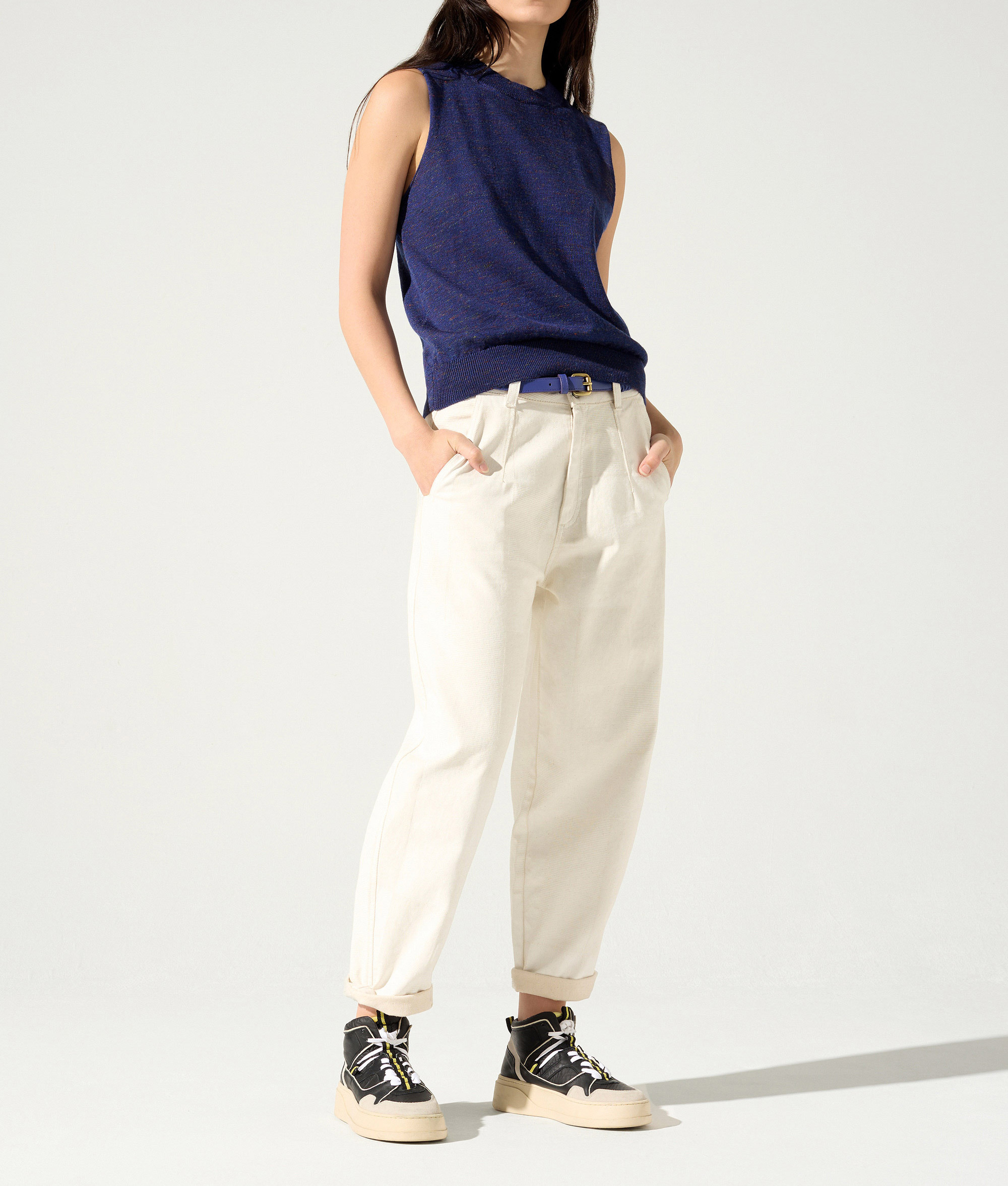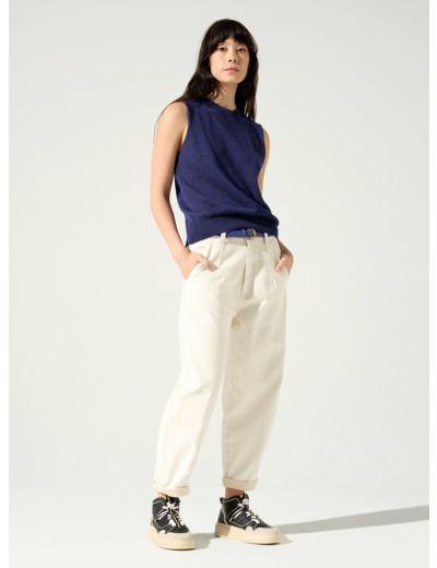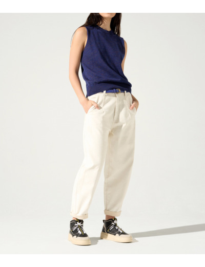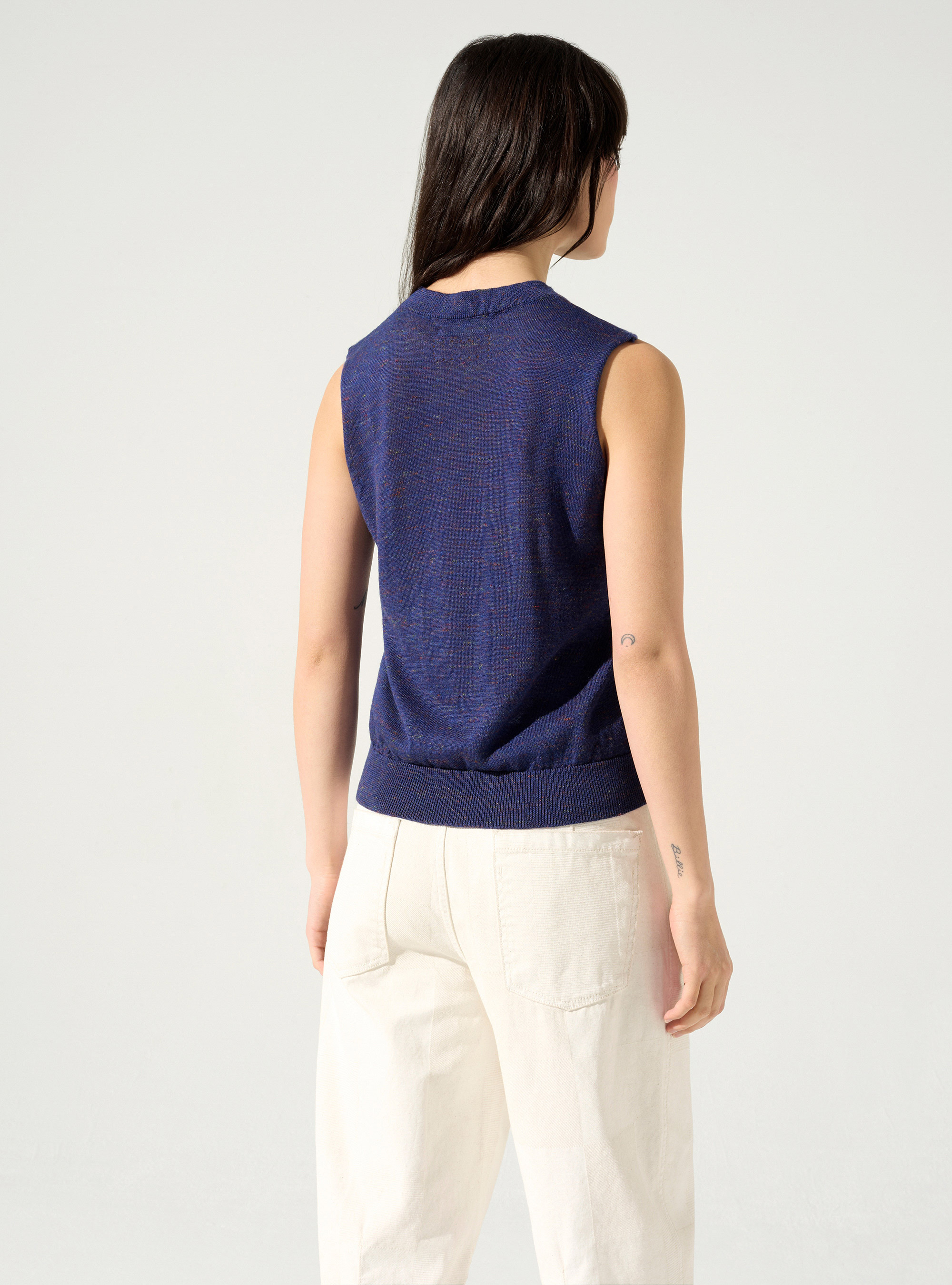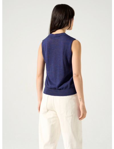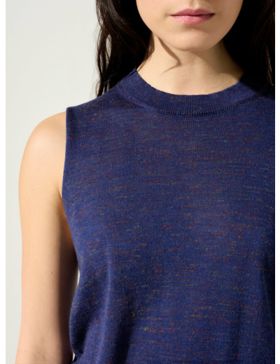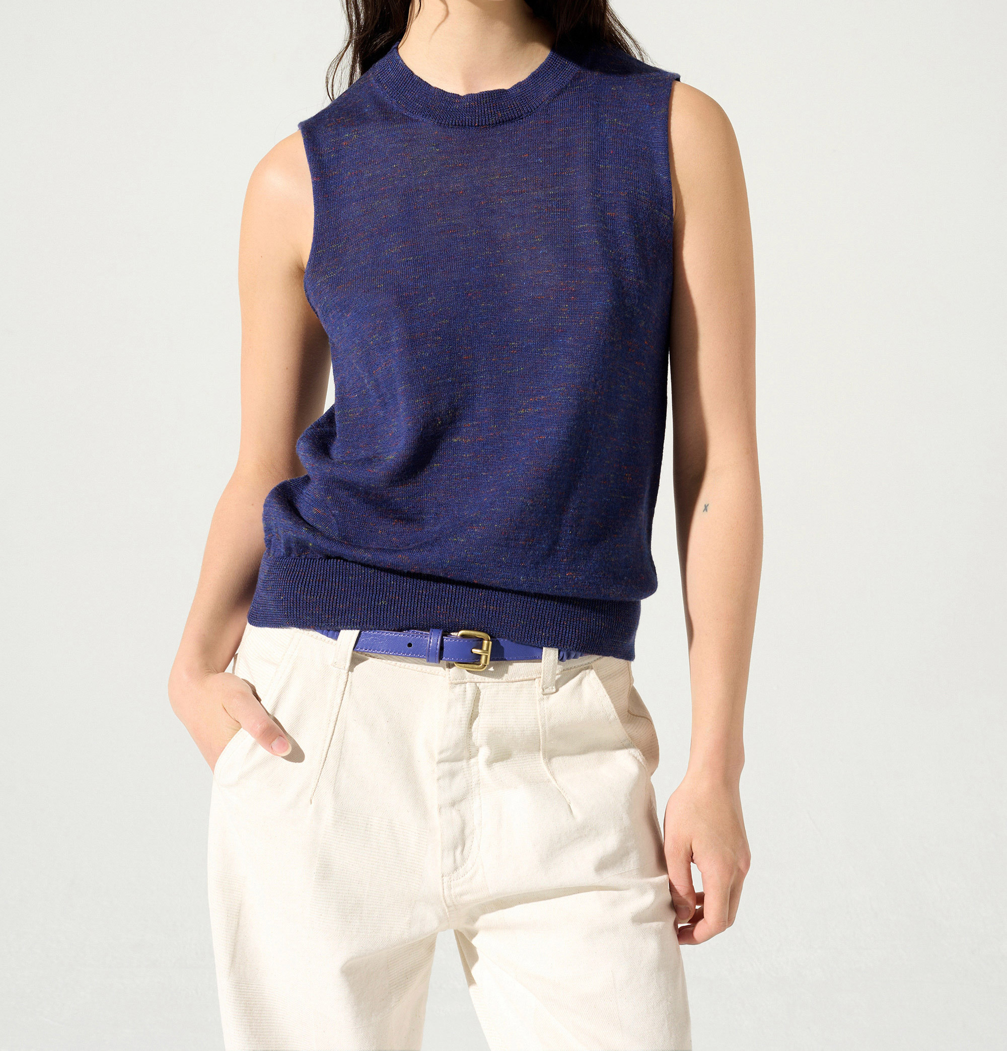 • Caractéristiques clés : Pull sans manches à l'encolure ronde et au volume ajusté, idéal pour mettre sur une chemise. Sa maille chinée avec fils contrastants apporte une touche originale à cette pièce.