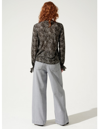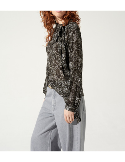 • Caractéristiques clés : Blouse près du corps avec col montant et nœud type lavallière à nouer. Les poignets sont boutonnés et également agrémentés de nœuds amovibles. Forme légèrement arrondie dans le bas de la pièce et ouverture au niveau de l'épaule gauche à l'aide de petites pressions posées à la main. Matière fluide et douce imprimée d'un dessin Maison élaboré par notre Bureau de style.